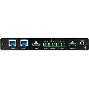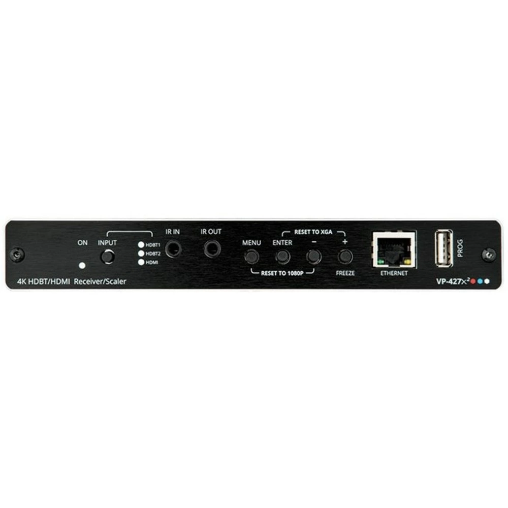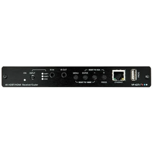 VP-427X2 – приемник / автокоммутатор / масштабатор сигналов HDMI разрешением от 640х480/60 до 4K/60 (4:4:4), двунаправленного интерфейса RS-232, ИК-управления и стереоаудио из витой пары 2xHDBaseT и локального входа HDMI с разрешением до 4K/60 (4:2:0). Поддержка HDCP 1.4 и 2.2. Выполняет повышающее / понижающее масштабирование видеосигнала, полученного по витой паре. Оснащен портами реле, RS-232, ИК-приемника и ИК-излучателя для удаленного управления подключенными по кабелю витой пары устройствами. Дальность приема – до 100 м для сигнала 4K.