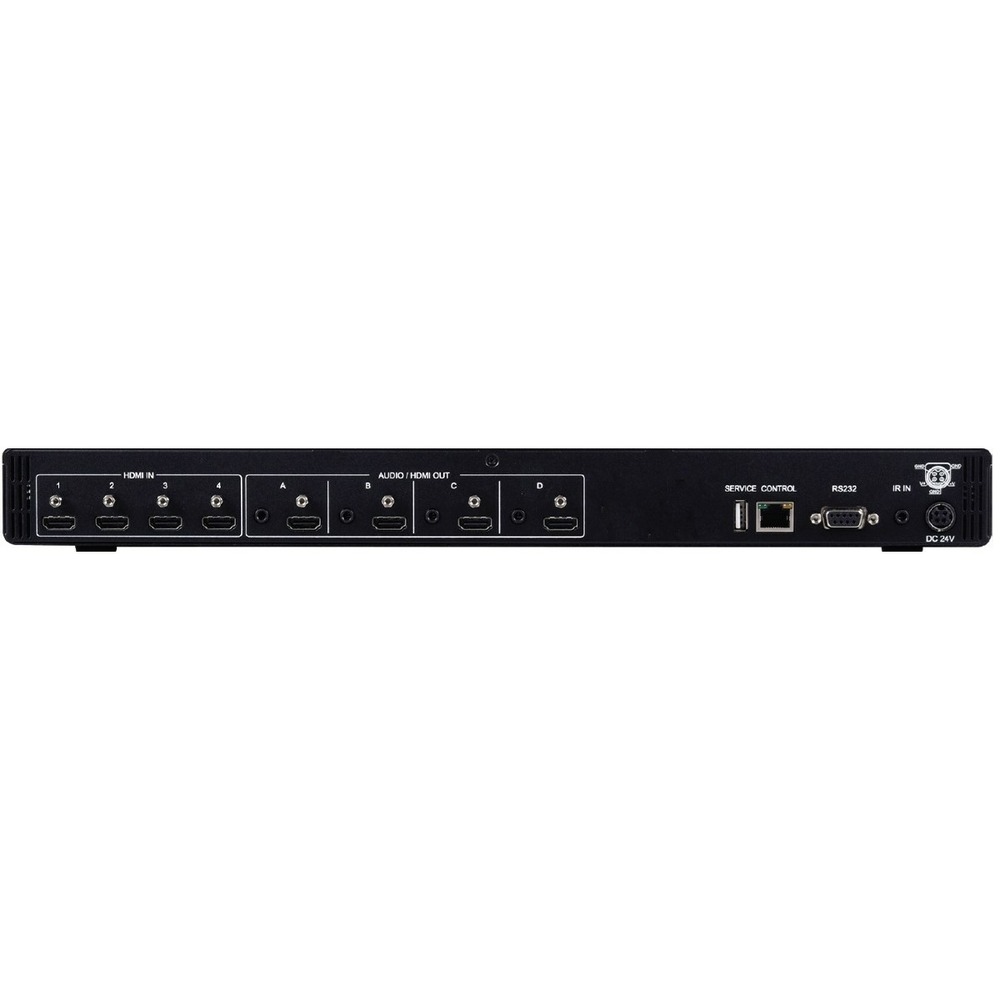 CPLUS-V4H4HPA – матричный коммутатор 4х4 сигналов интерфейса HDMI 2.0 разрешением до 4096x2160/60, 3D (цветовое пространство 4:4:4) с поддержкой технологии HDR, HDCP 1.4, 2.2 и расширенным набором заводских конфигураций EDID-блока. Наряду с выходными разъемами HDMI присутствуют соответствующие разъемы стереоаудио (4х miniJack 3,5 мм). Полоса пропускания 600 МГц. Поддержка эмбеддированного аудио в форматах LPCM 7.1, Bitstream и HD Bitstream. Управление прибором осуществляется по ИК, RS-232 и IP (Telnet и web-интерфейс).