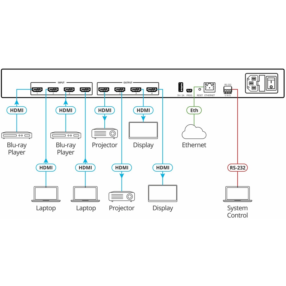 Управление Кнопки выбора входов/выходов, выбора источника аудио, сохранения и вызова пресетов, блокировки лицевой панели, считывания EDID, интерфейсы управления: Ethernet, RS-232, встроенные веб-страницы