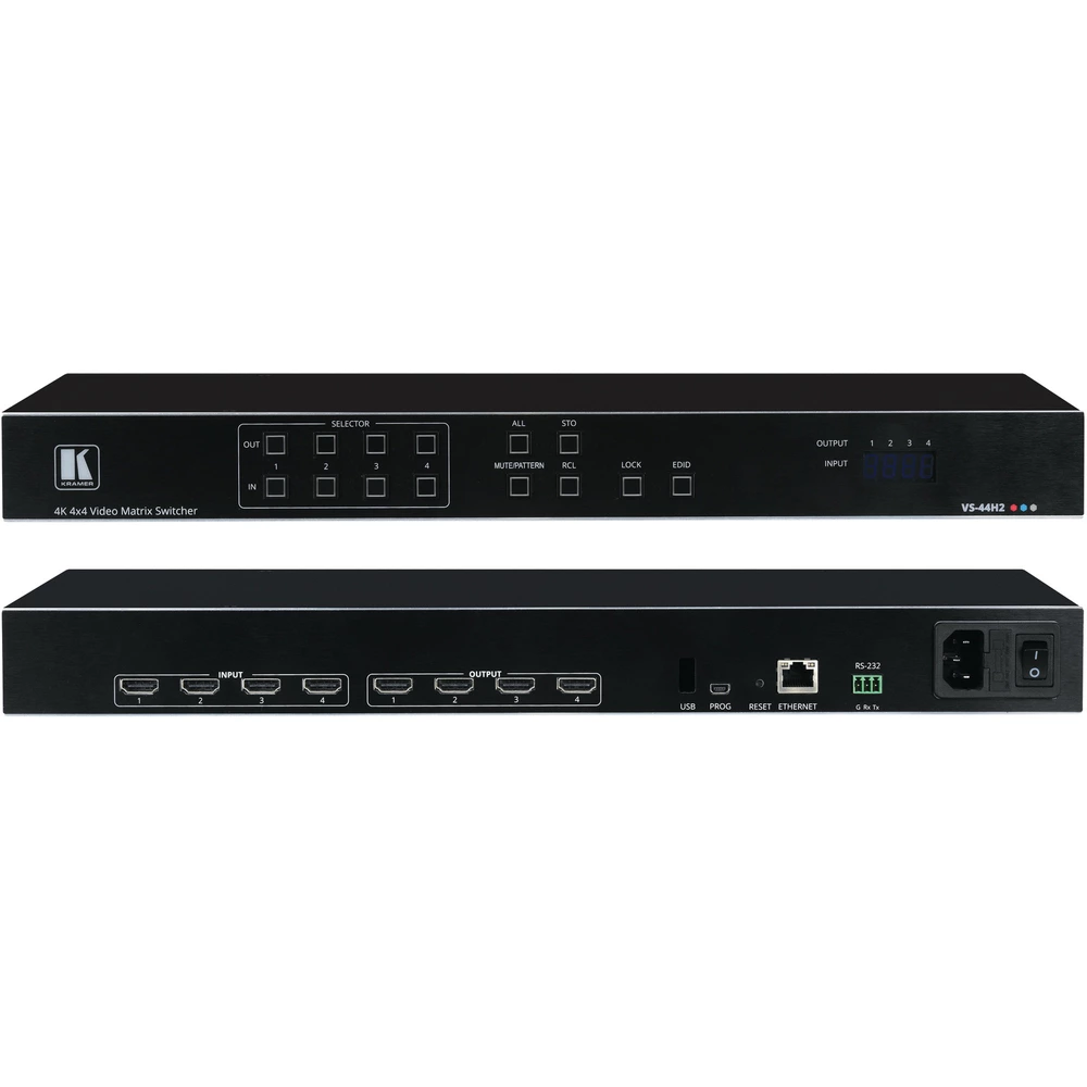 VS-44H2 — матричный коммутатор 4х4 сигналов HDMI c поддержкой разрешений до 4K@60 Гц (4:4:4) и технологии HDR. Прибор осуществляет перетактирование входного сигнала, компенсацию АЧХ кабеля и переключение сигнала HDMI от любого из четырёх источников сигнала, возможно, поддерживающих HDCP-кодирование, на любой из четырех выходов, на любой набор выходов или на все выходы одновременно.