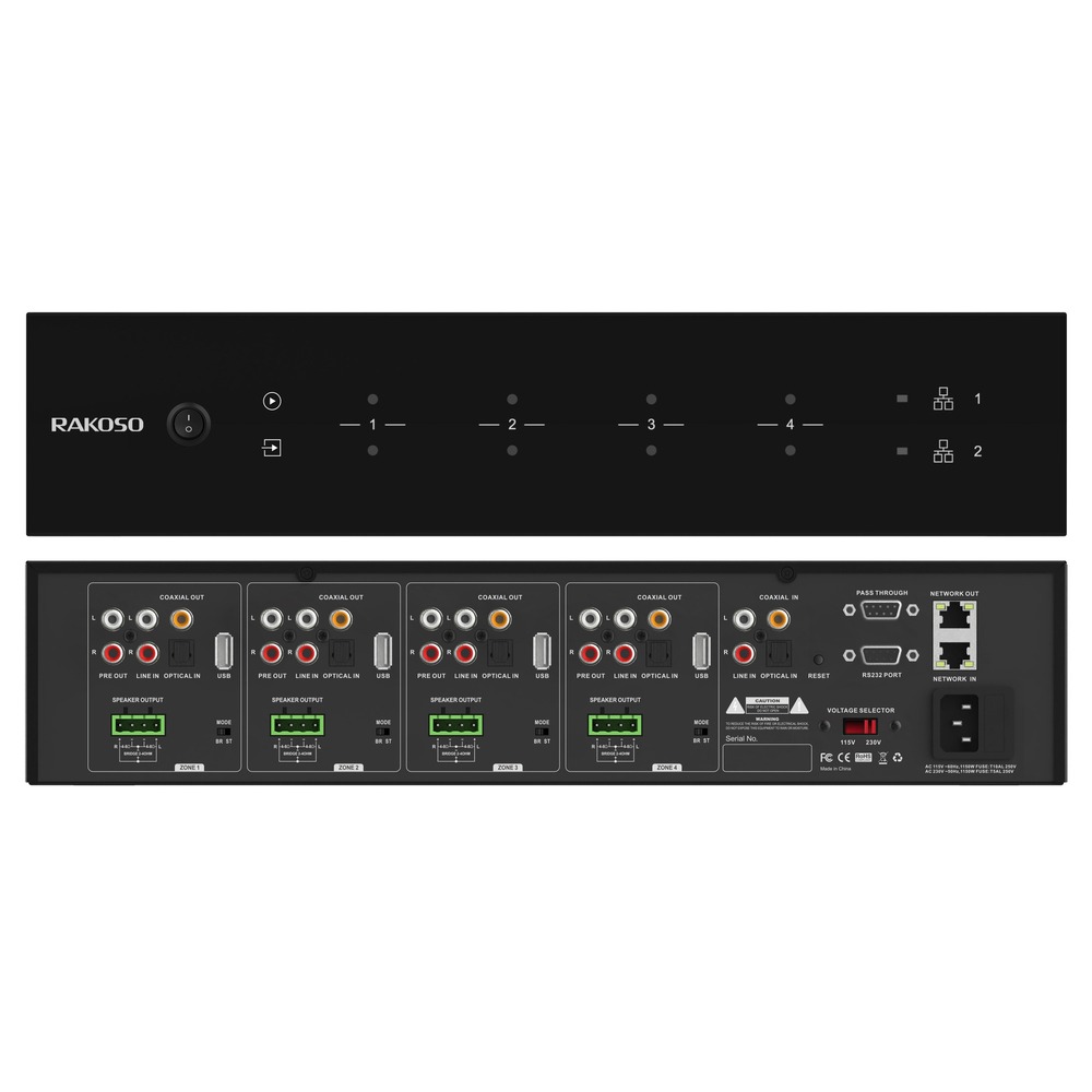 Rakoit RAKOSO HA400 поставляется с 4 различными зонами, каждая из которых представляет собой усилитель мощностью 50 Вт x 2 при 8 Ом. Каждый усилитель может переключаться между стереорежимом и мостовым режимом. Вы можете легко транслировать музыку в 4 разные комнаты в вашем доме.