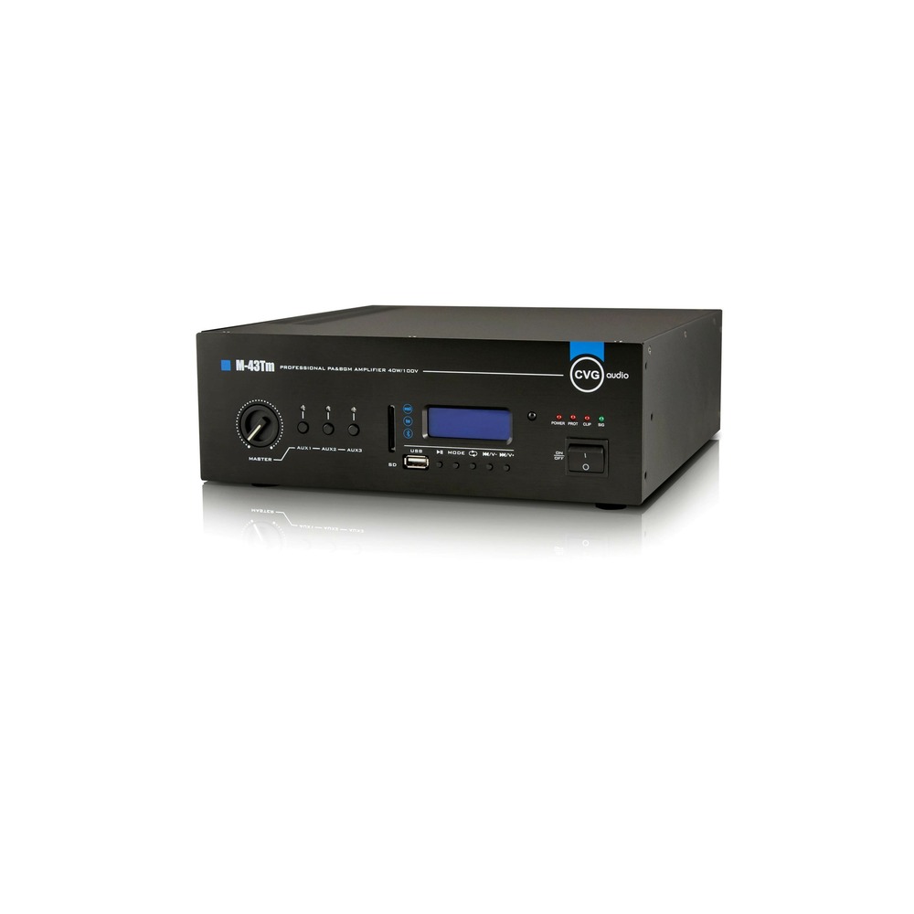CVGaudio M-43Tm – данный усилитель имеет очень богатый функционал соответствующий всем современным запросам. Усилитель оснащен модулем источника сигнала, который состоит из MP/WMA плеера способного проигрывать музыкальные треки с USB флешь накопителей и SDcard объемом до 32Gb, FM радио с памятью на двадцать радиостанций и разъемом для подключения внешней FM антенны и Bluetooth для беспроводного воспроизведения музыкальных треков с мобильных устройств. Модуль источника сигнала может управляться как с корпуса усилителя, так и с помощью дистанционного IR пульта управления.