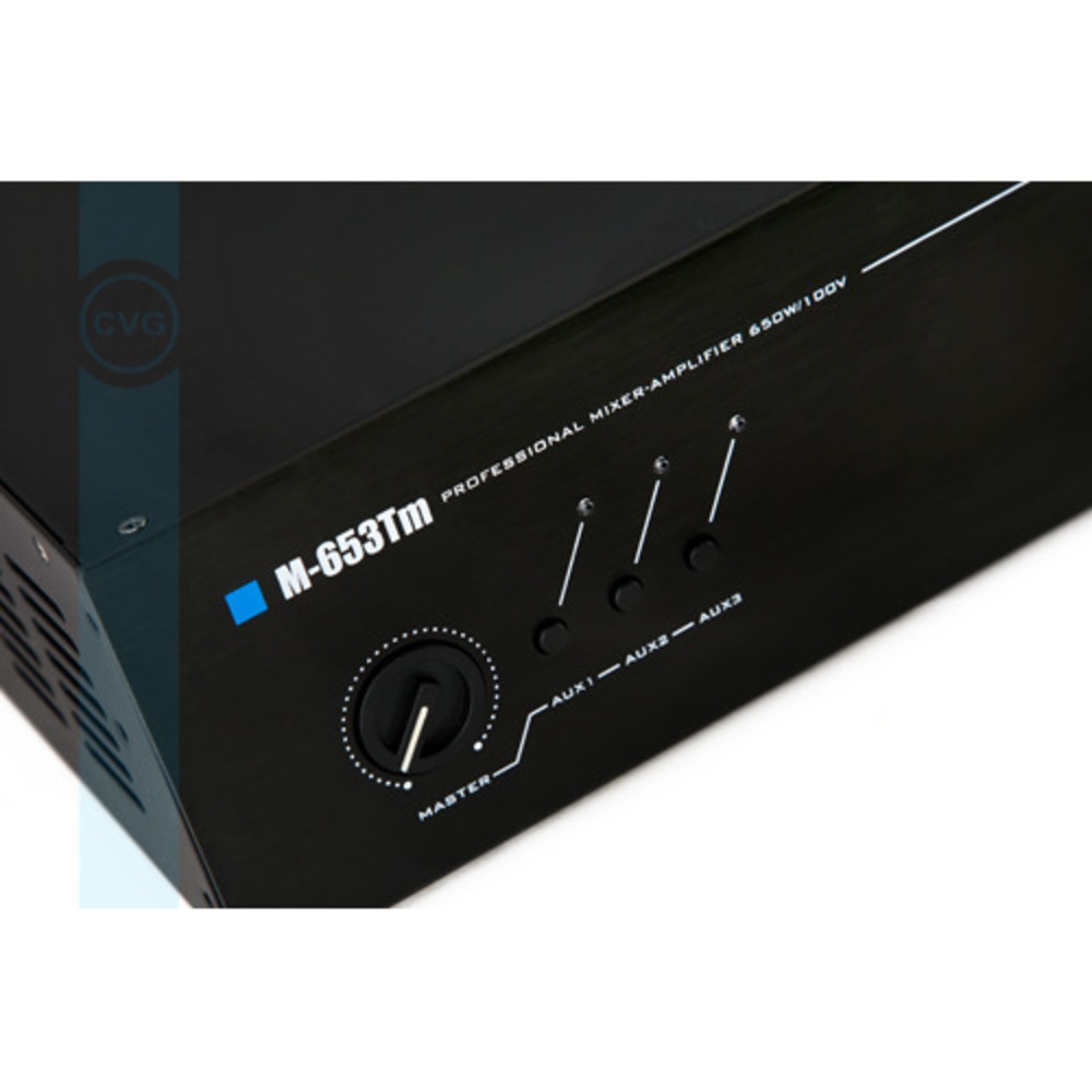 CVGaudio M-653Tm – профессиональный микшер – усилитель со встроенным модулем источника сигнала предназначенный для организации качественной трансляции фоновой музыки и речевого оповещения в торговых и общественных помещениях. Данная модель обеспечит отличное качество звучания и богатый функционал. Встроенный модуль источника состоит из MP3 плеера с возможностью проигрывания музыкальных треков с SDcard и USB флешь накопителей объемом до 32Gb, FM тюнера с памятью на 20 станций и возможностью подключения внешней антенны, а также Bluetooth модуля для проигрывания треков с мобильных устройств. Усилитель имеет мощность 650W и может работать как в трансформаторном 100V (основной режим работы), так и низкоомном 4-16ohm. Усилитель одноканальный, подключаемые к нему стереофонические линейные сигналы от источников звука корректно суммируются и на акустические системы подается уже усиленный монофонический сигнал, более корректный для систем фонового звука и Public Address (обеспечивающий более равномерное звуковое поле). Помимо встроенного звукового модуля CVGaudio M-653Tm имеет три линейных входа выполненные на разъемах 2RCA с возможностью выбора активного с помощью селектора на лицевой панели. Каждый вход имеет индивидуальную настройку чувствительности c обратной стороны усилителя. Первый канал селектора соответствует встроенному модулю источника сигнала. По умолчанию при включении модуль переводится в режим проигрывания MP3 фалов с USB / SDcard. Последовательным нажатием кнопки MODE можно выбрать другие режимы работы модуля – FM / Bluetooth / Line in (AUX 1). Также усилитель имеет два универсальных балансных входа выполненных на комбо-разъемах TRS Jack 6.3mm / XLR. Настраиваемый уровень чувствительности данных входов позволяет использовать их как для подключения микрофонов, так и источников сигнала линейного уровня. Линейные и балансные входа имеют раздельные двухполосные эквалайзеры, что позволяет осуществлять тонкую настройку звучания как для микрофонов, так и для устройств воспроизведения музыкального контента. Каждый балансный вход имеет возможность активации приоритета над линейными входами и встроенным плеером, а также подключения фантомного питание 24V для работы с конденсаторными / электретными микрофонами. Если включен селектор активации приоритета, то при появлении входящего звукового сигнала на контактах данного входа все остальные линейные входа мьютируются. Также мьютирование можно осуществлять с помощью управляющих контактов – MUSIC MUTE и FULL MUTE. При замыкании пары контактов MUSIC MUTE все линейные входа и встроенный звуковой модель мьютируются, а при замыкании контактов FULL MUTE мьютируюся все полностью (контакты “нормально разомкнутые”). Данная возможность позволяет интегрировать усилитель CVGaudio M-653Tm в систему пожарного оповещения и другие системы автоматики, где требуется управление через “сухие контакты”. Данная модель имеет актуальный пожарный сертификат и может использоваться в системах аварийно-пожарного оповещения. Усилитель выполнен в металлическом корпусе, лицевая панель из алюминия. Для установки в монтажный шкаф в комплекте имеются кронштейны, высота прибора в монтажной стойке - 2U. Основная масса элементов управления усилителя вынесена на заднюю панель, что ограничивает не санкционированный доступ к ним со стороны обслуживающего персонала. Встроенн