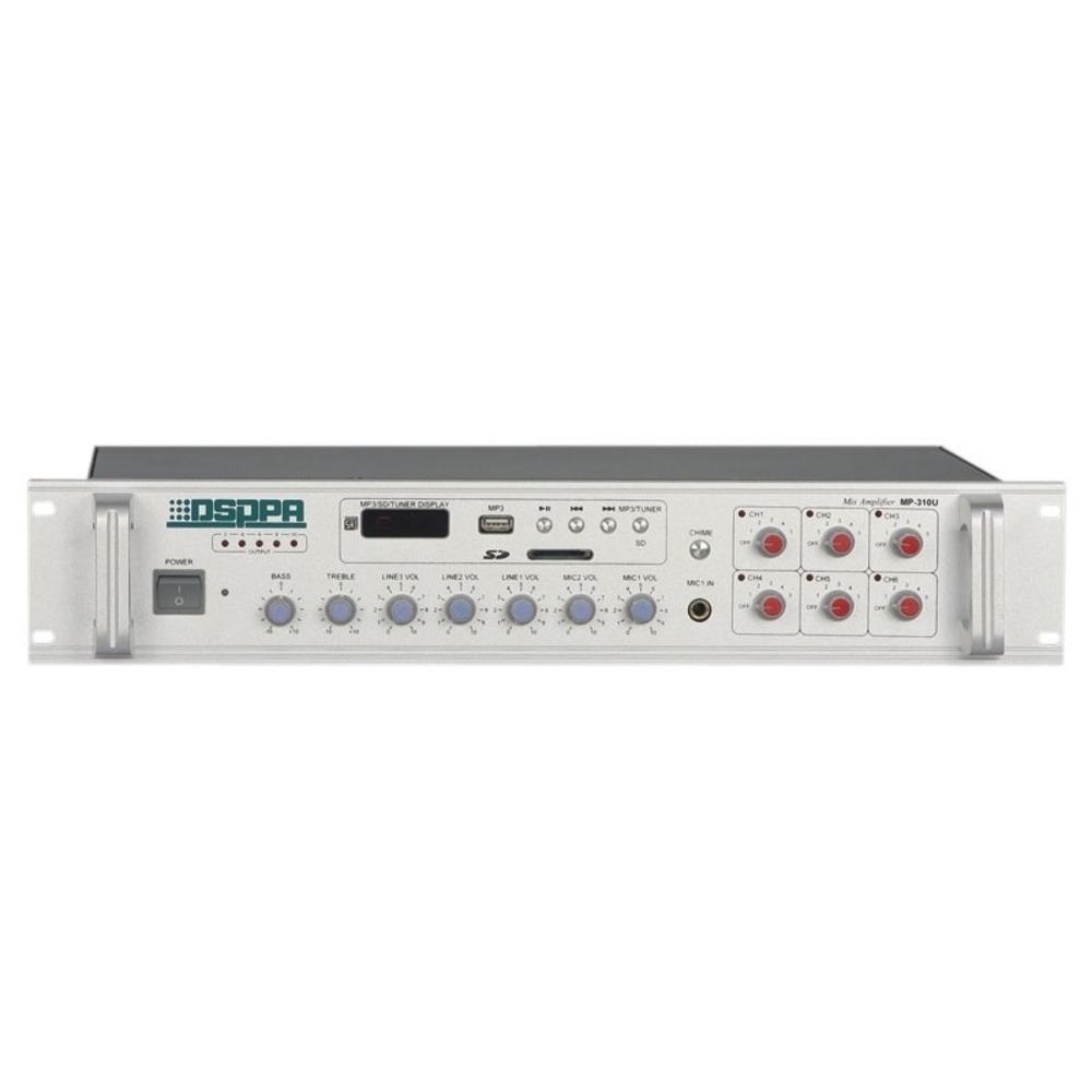 Тип - комбинированный микшер-усилитель, • - встроенные источники аудио-сигнала: цифровой am/fm тюнер, mp3 плеер, вход usb для карт flash памяти., • - 6 зон трансляции с регулировкой уровня выходного сигнала., • - 4 микрофонных входа, 3 линейных входа, 1 aux выход..