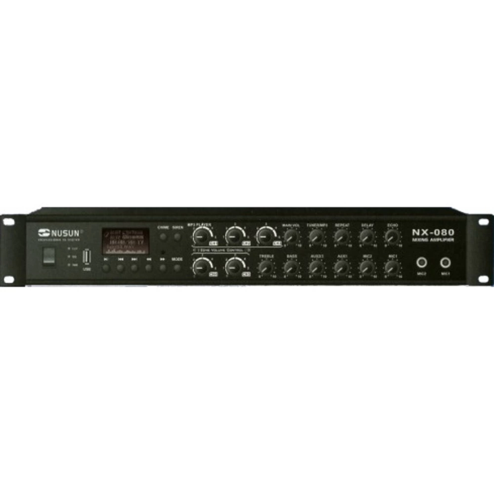Nusun NX-080 - трансляционный 5-ти зонный микшер-усилитель мощностью 80 Вт. FM -тюнер. LCD-дисплей. Дистанционное управление . USB-интерфейс с поддержкой MP-3, WMA файлов. Индивидуальное подключение зон с регулировкой уровня громкости ( с индикацией ), индивидуальная регулировка входного уровня на каждом входе, функция приоритета, сигналы оповещения, 6 степеней защиты, принудительное охлаждение, память на отключение.