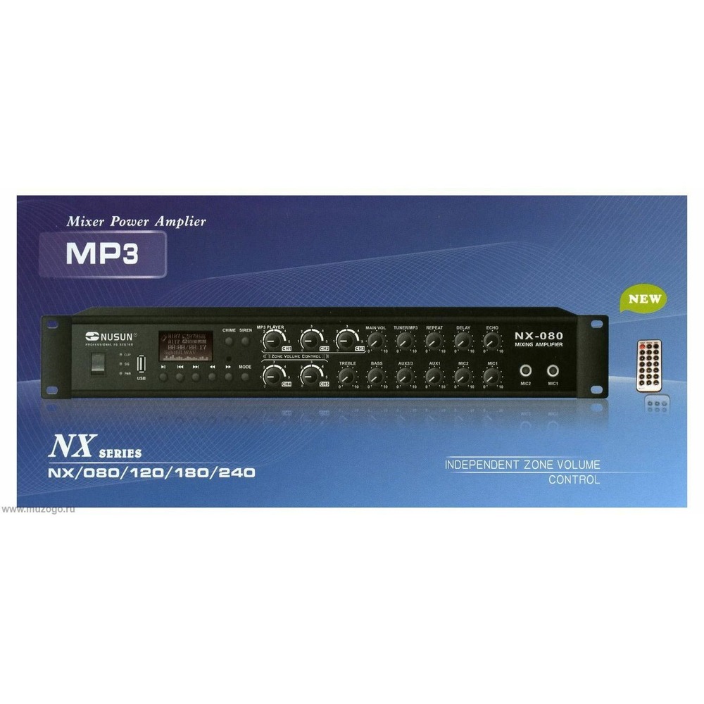 Nusun NX-240 - трансляционный 5-ти зонный микшер-усилитель мощностью 240 Вт. FM -тюнер. LCD-дисплей. Дистанц.управление . USB-интерфейс с поддержкой MP-3, WMA файлов. 2 микр. ( 1,4" Jack ) и 2 лин. входа( RCA ) 1лин. выход(RCA) Индивидуальное подключение зон с регулировкой уровня громкости ( с индикацией ).