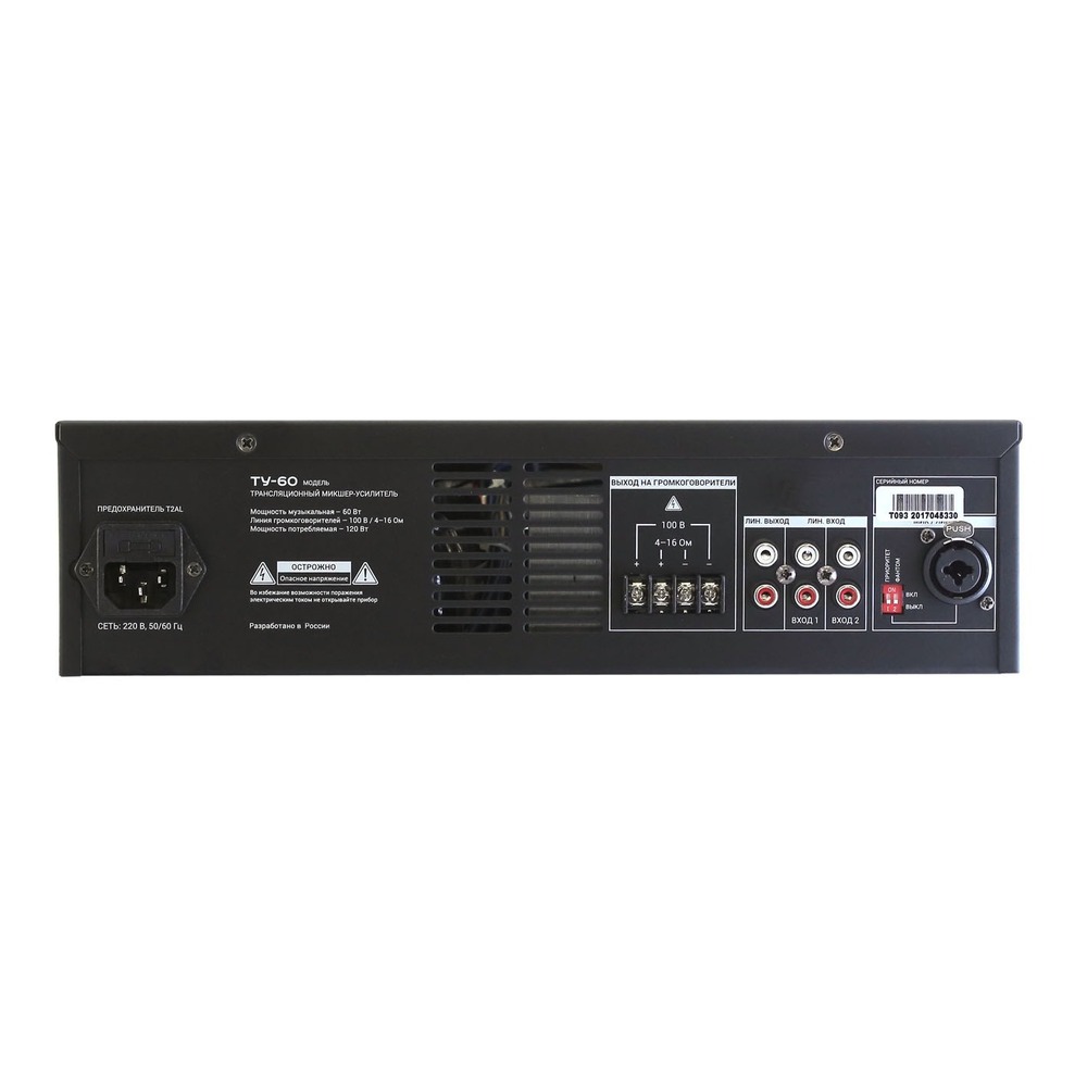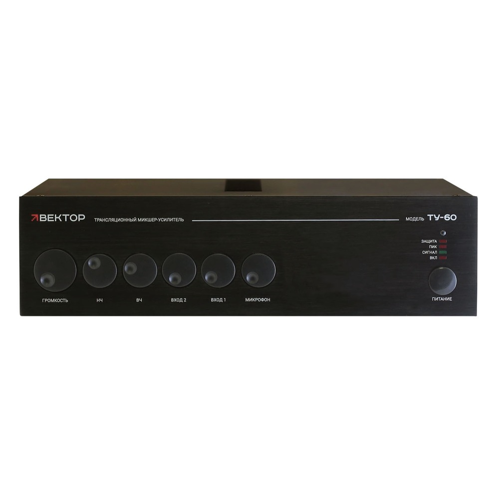 ВЕКТОР ТУ-60 Компактный микшер-усилитель. Мощность 60Вт. Выход 100В 4-16Ом, 1 микр и 2 AUX входа, 1 AUX выход. Питание 220В. Размеры 330 х 88 х 250 мм. Вес 4,2 кг.