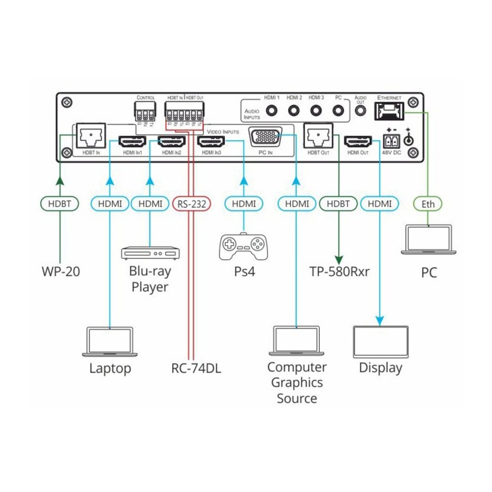 Выходы 1 – HDMI, тип A (розетка), 1 – HDBaseT, разъем RJ45 (розетка), 1 – небалансное стерео, разъем miniJack 3,5 мм (розетка)