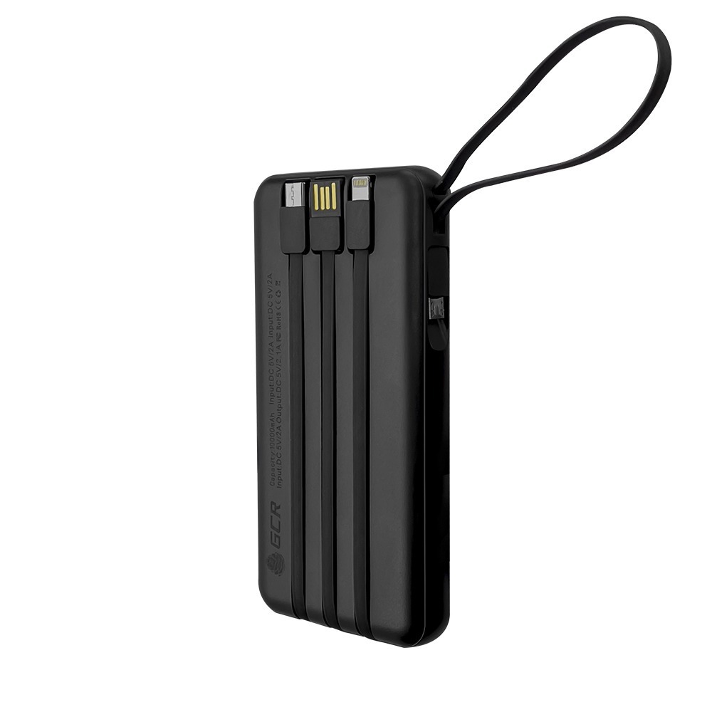 GCR PowerBank на 10000mAh со встроенным кабелем USB / MicroUSB / TypeC / Lightning + фонарик, черный