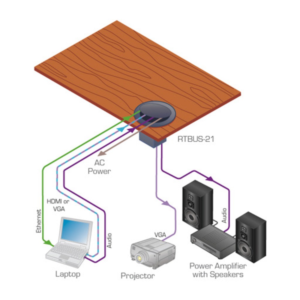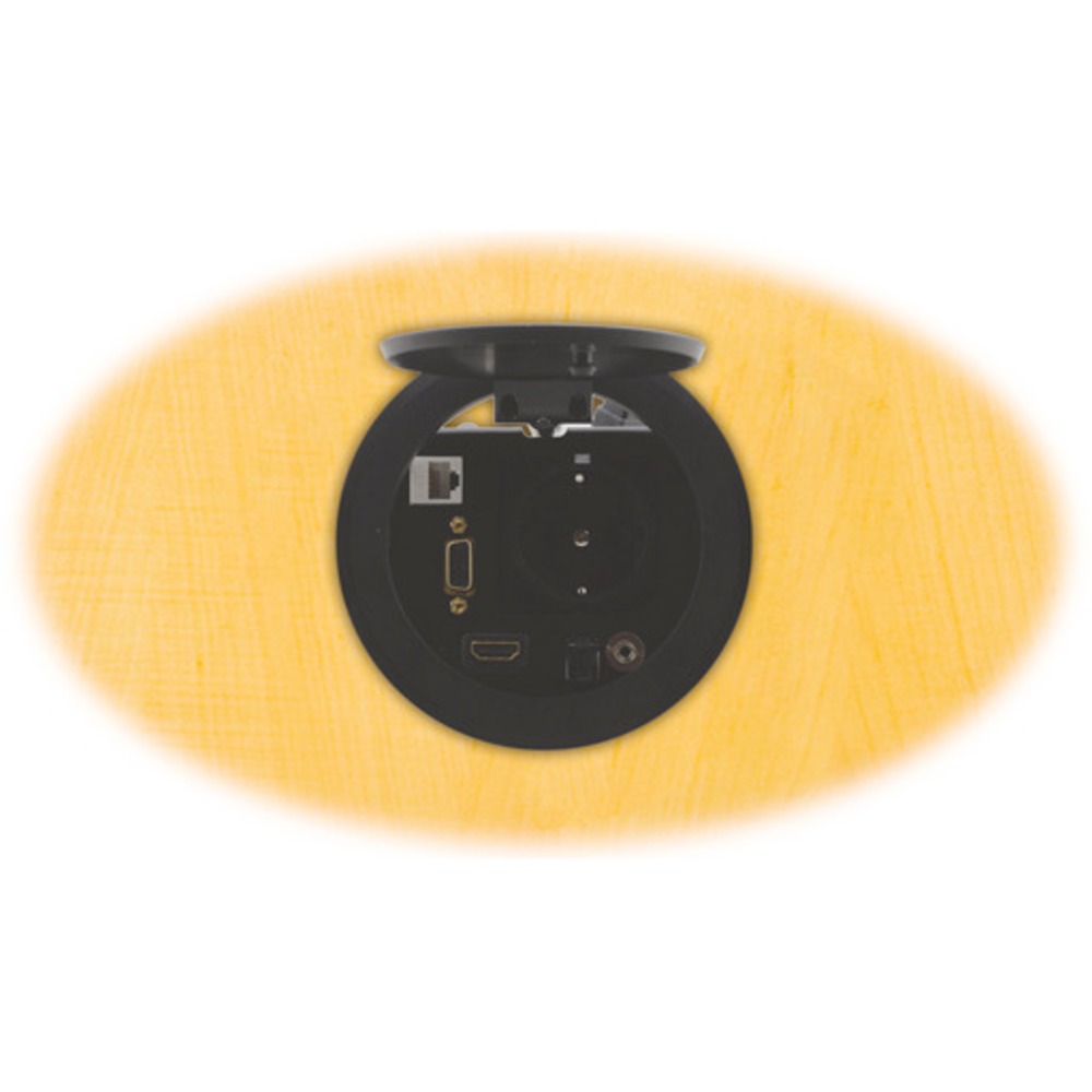 RTBUS-21/DE/220V(B) – коробка с набором разъемов для подключения аудиовизуальной аппаратуры с пневматической крышкой, располагается под деревянной столешницей или подиумом. Коробка соединяется с презентационной системой помещения. Черный анодированный алюминий.