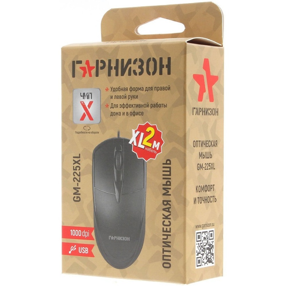 Гарнизон GM-225XL это удобная в использовании, чувствительная и надёжная в работе проводная оптическая мышь с помощью которой вы легко сможете управлять работой компьютера. Девайс подключается к компьютеру или ноутбуку с помощью интерфейса USB, что обеспечивает стабильность связи и высокую скорость взаимодействия. Питание мыши осуществляется непосредственно от USB. Разрешение используемого в конструкции девайса сенсора составляет 1000 dpi. Благодаря этому мышка чутко реагирует на команды пользователя и может использоваться для решения различных задач. Гарнизон GM-225XL отлично подойдёт как для работы с офисными программами и приложениями, так и для игры в самые требовательные шутеры, бродилки и стрелялки. Корпус мыши изготовлен из качественного пластика окрашенного в черный цвет. Конструкция девайса продумана до мелочей и создана таким образом, чтобы обеспечить пользователю удобный охват ладонью руки и высокий уровень комфорта при использовании. Для отдачи команд в конструкции Гарнизон GM-225XL предусмтрены стандартные клавиши и колесо прокрутки. Девайс совместим с наиболее распространёнными операционными системами и при его подключении не требуется установка дополнительных драйверов.