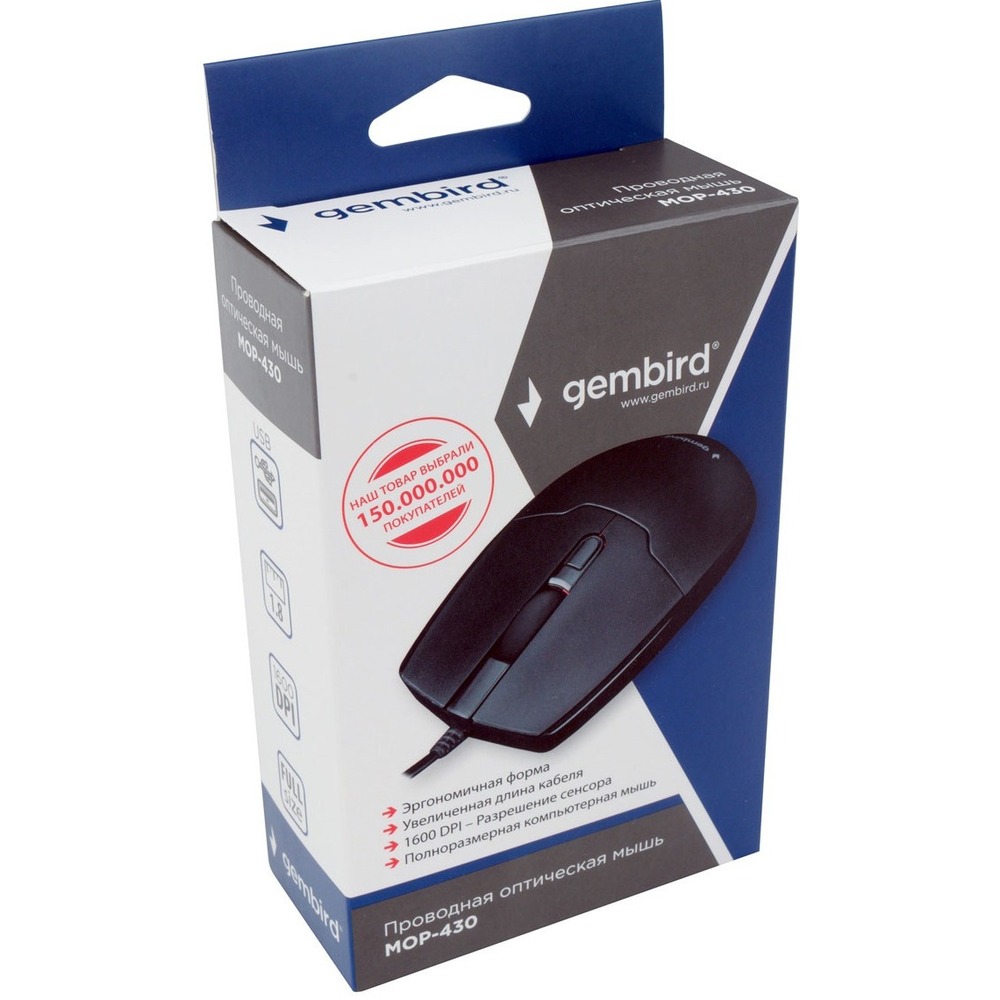 Gembird MOP-430 это удобная в использовании, чувствительная и надёжная в работе проводная оптическая мышь с помощью которой вы легко сможете управлять работой компьютера. Девайс подключается к компьютеру или ноутбуку с помощью интерфейса USB, что обеспечивает стабильность связи и высокую скорость взаимодействия. Питание мыши осуществляется непосредственно от USB. Разрешение используемого в конструкции девайса сенсора составляет 1600 dpi. Благодаря этому мышка чутко реагирует на команды пользователя и может использоваться для решения различных задач. Gembird MOP-430 отлично подойдёт как для работы с офисными программами и приложениями, так и для игры в самые требовательные шутеры, бродилки и стрелялки. Корпус мыши изготовлен из качественного пластика окрашенного в черный цвет. Конструкция девайса продумана до мелочей и создана таким образом, чтобы обеспечить пользователю удобный охват ладонью руки и высокий уровень комфорта при использовании. Для отдачи команд в конструкции Gembird MOP-430 предусмтрены стандартные клавиши и колесо прокрутки. Девайс совместим с наиболее распространёнными операционными системами и при его подключении не требуется установка дополнительных драйверов