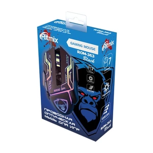 Ritmix ROM-363 - проводная оптическая мышь с подсветкой. Яркий геймерский дизайн с удобным хватом не оставит равнодушным тех, кто не только играет, но и использует мышь в обычном режиме. Данная модель отлично работает практически на любой поверхности. Помогает ей в этом оптический сенсор с разрешение 3200 dpi. В устройстве используются 7 кнопок, с которыми удобнее выполнять различные базовые действия, такие как серфинг в интернете с боковыми кнопками вперед-назад, и другие. Корпус имеет 4 варианта подсветки.