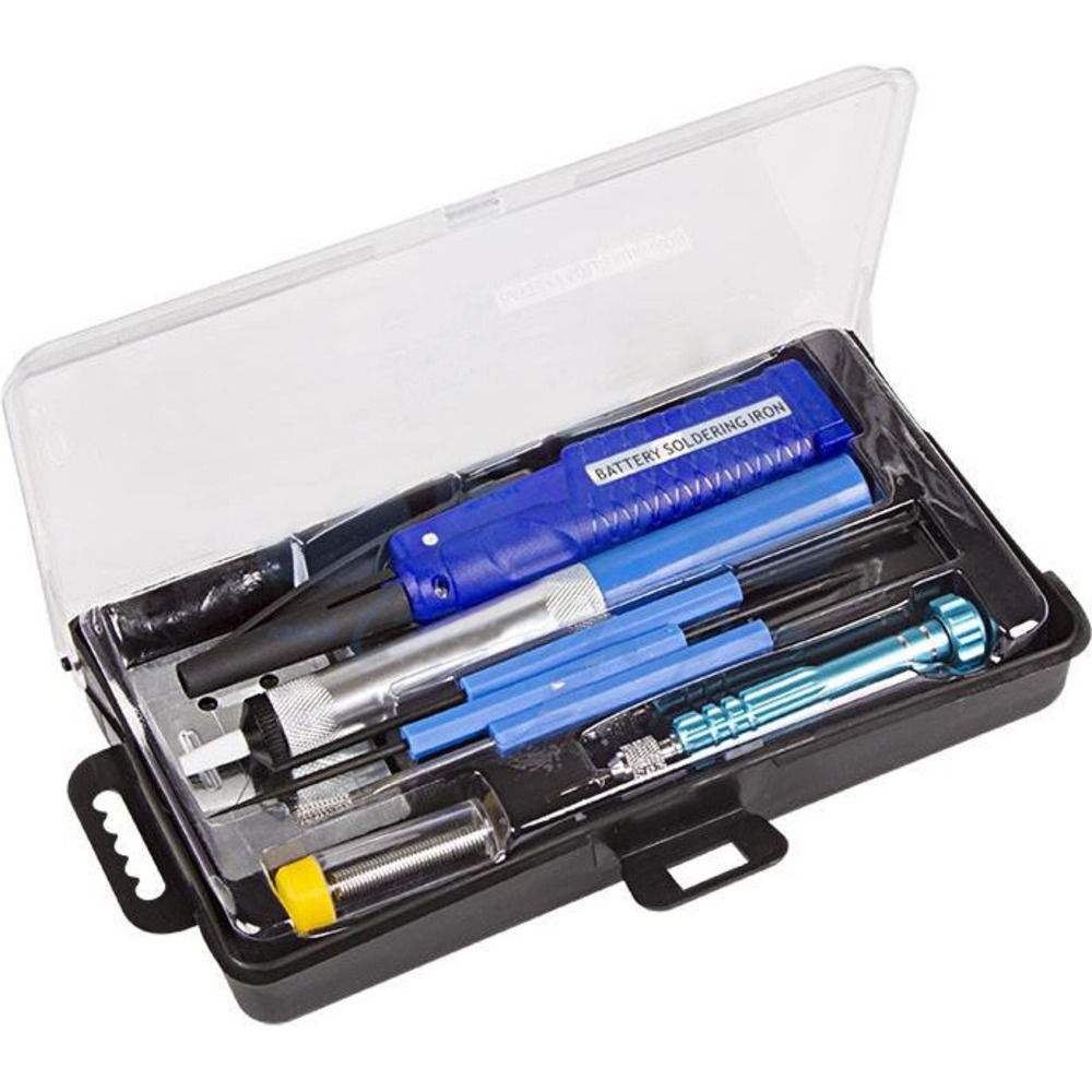 Набор для пайки (паяльник 8 Вт, оловоотсос, подставка, припой, отвертка, инструмент для монтажа) REXANT позволит эффективно, быстро и самостоятельно отремонтировать электротехнику или произвести монтаж оборудования в местах, где отсутствует доступ к электропитанию.