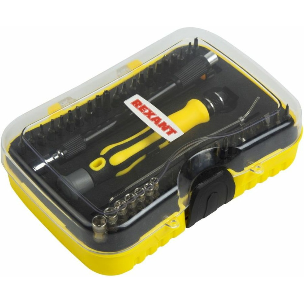 Набор отверточный REXANT 12-4706 состоит из 45 предметов, здесь есть насадки-биты, отвертка, головки, пинцет и гибкий удлинитель. Биты изготовлены из прочной стали. Магнитный держатель крепко фиксирует насадку и исключает вероятность срыва резьбы или слома детали.