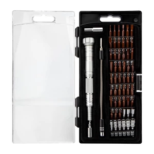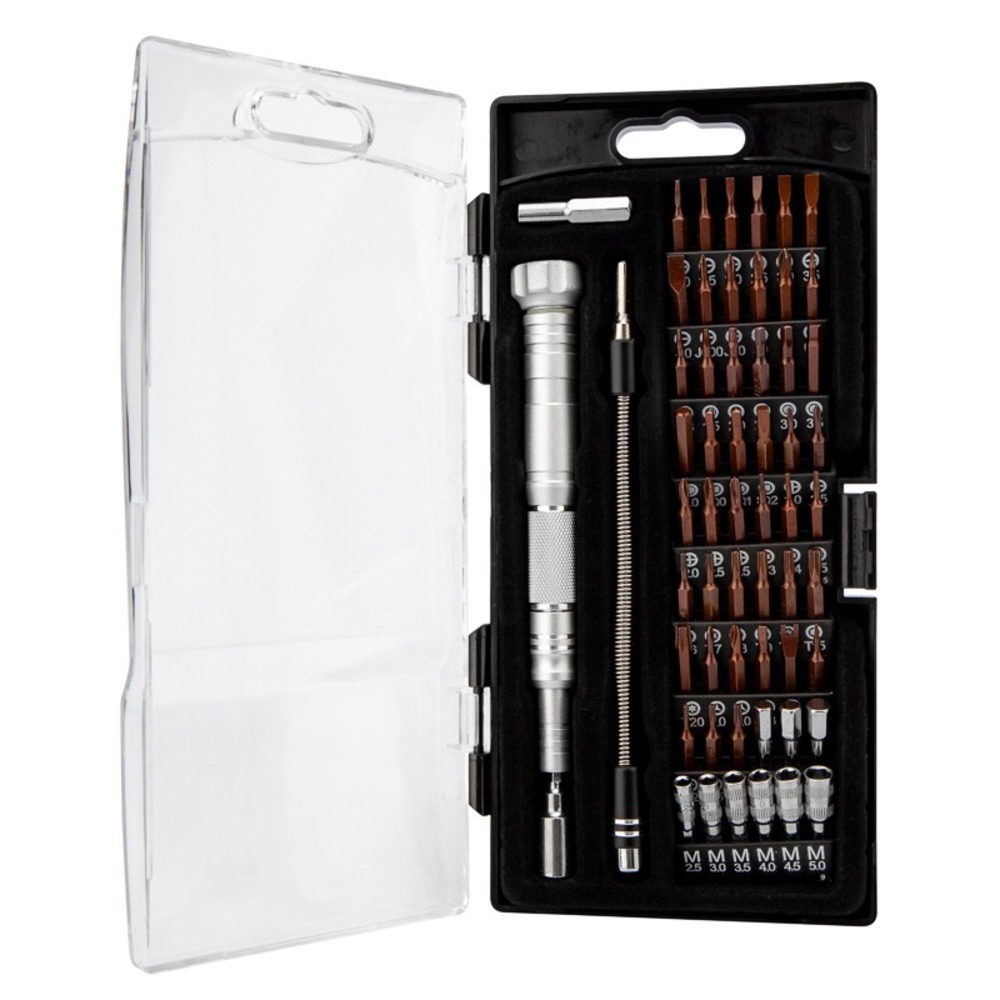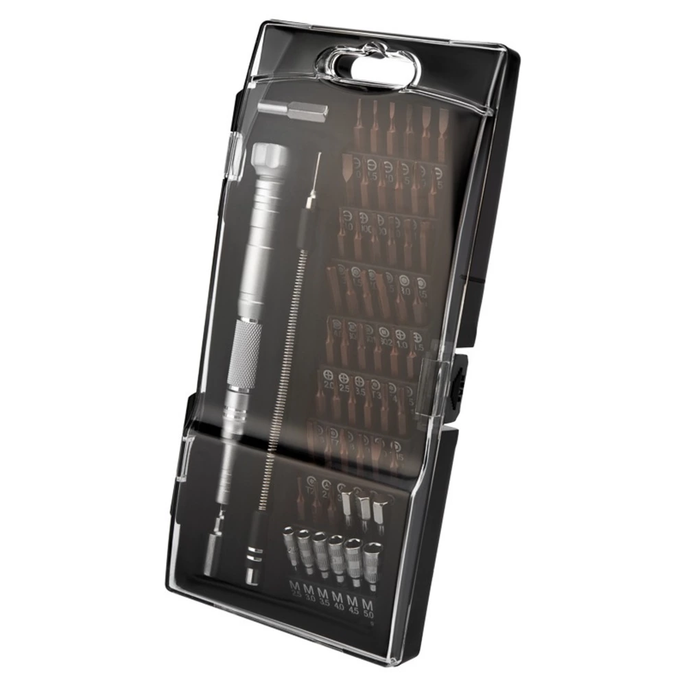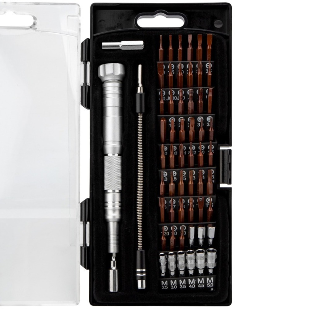Набор отверток для точных работ KRANZ отлично подходит для ремонта телефонов, компьютеров, приемников и для многих популярных приборов, которые используются в быту. Выполнен из качественной инструментальной стали S2, обладающей высокой прочностью к механическим повреждениям. Точно подобранные по характеристикам магнитные насадки отлично подходят для профессионального ремонта и для мелких бытовых работ. В наборе 62 предмета: M2.5, M3.0, M3.5, M4.0, M4.5, M5.0 SL1.0*2, SL1.5*2, SL2.0, SL2.5, SL3.0, SL3.5, SL4.0 PH000, PH00, PH0, PH1.0*2, PH1.5, PH2.0, PH2.5, PH3.5 H0.9, H1.3, H1.5, H2.0, H2.5, H3.0, H3.5, H4.0, H4.5, H5.0, H6.0 T2, T3, T4, T5, T6, T7, T8, T9, T10, T15, T20 Triangle: 2.3 Tri-wing: 2.0, 3.0 Pentable 0.8, 1.2, 1.5, 2.0 SQ: SQ 0, SQ 1, SQ 2 U2.6 Special PH1.5 Рукоятка Гибкий удлинитель Переходники H4.0 и H6,3 Посадка бит: 1,8