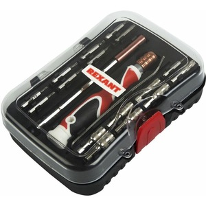Все предметы в наборе отверточном REXANT 12-4771 произведены из материалов высокого качества и отличаются долговечностью. Наконечники изготовлены из сплава металлов, отвертка - из практичного пластика. Также в кейсе специалисты найдут пинцет и специальный удлинитель.