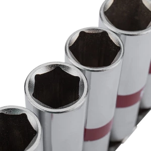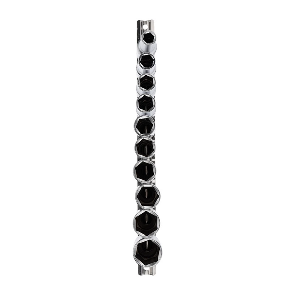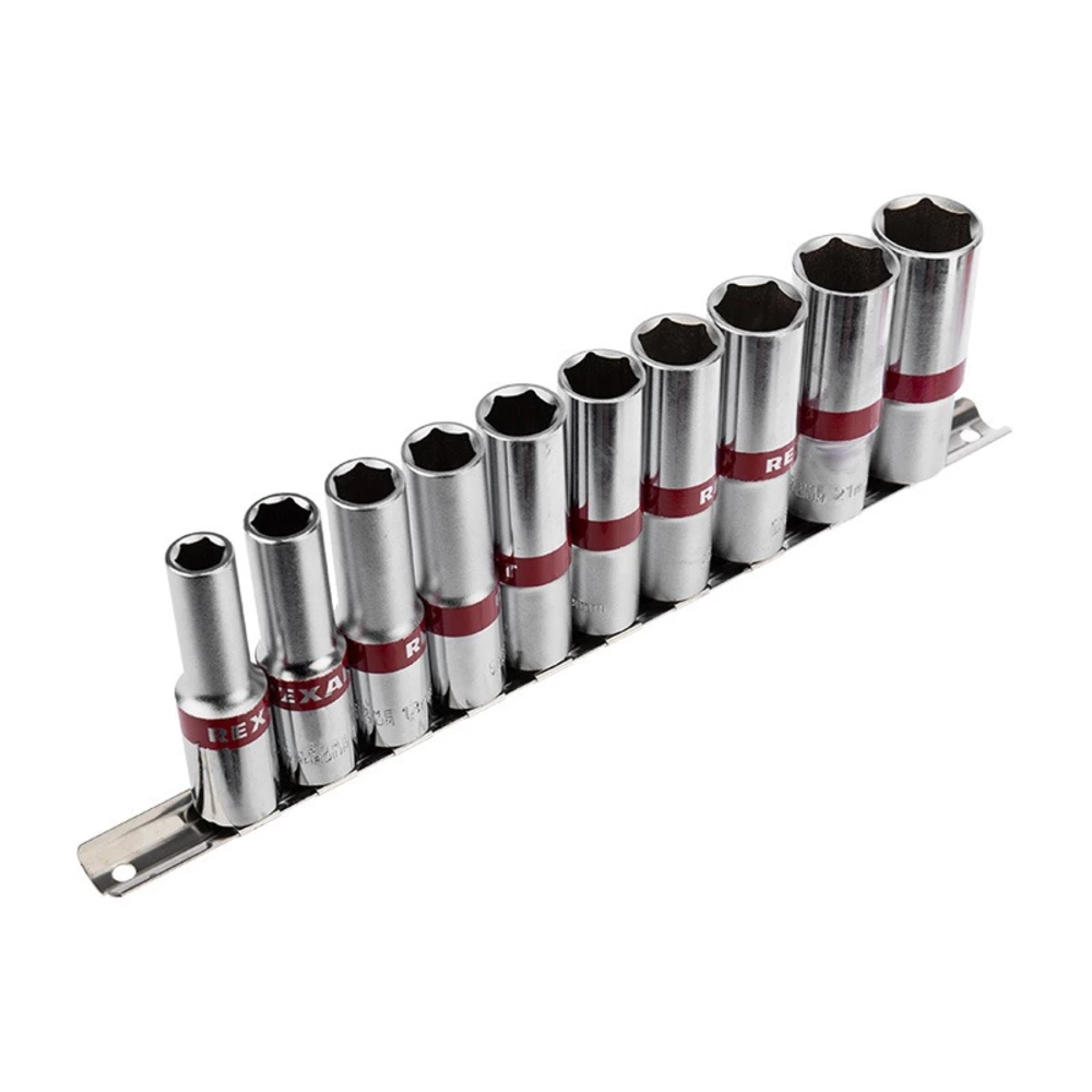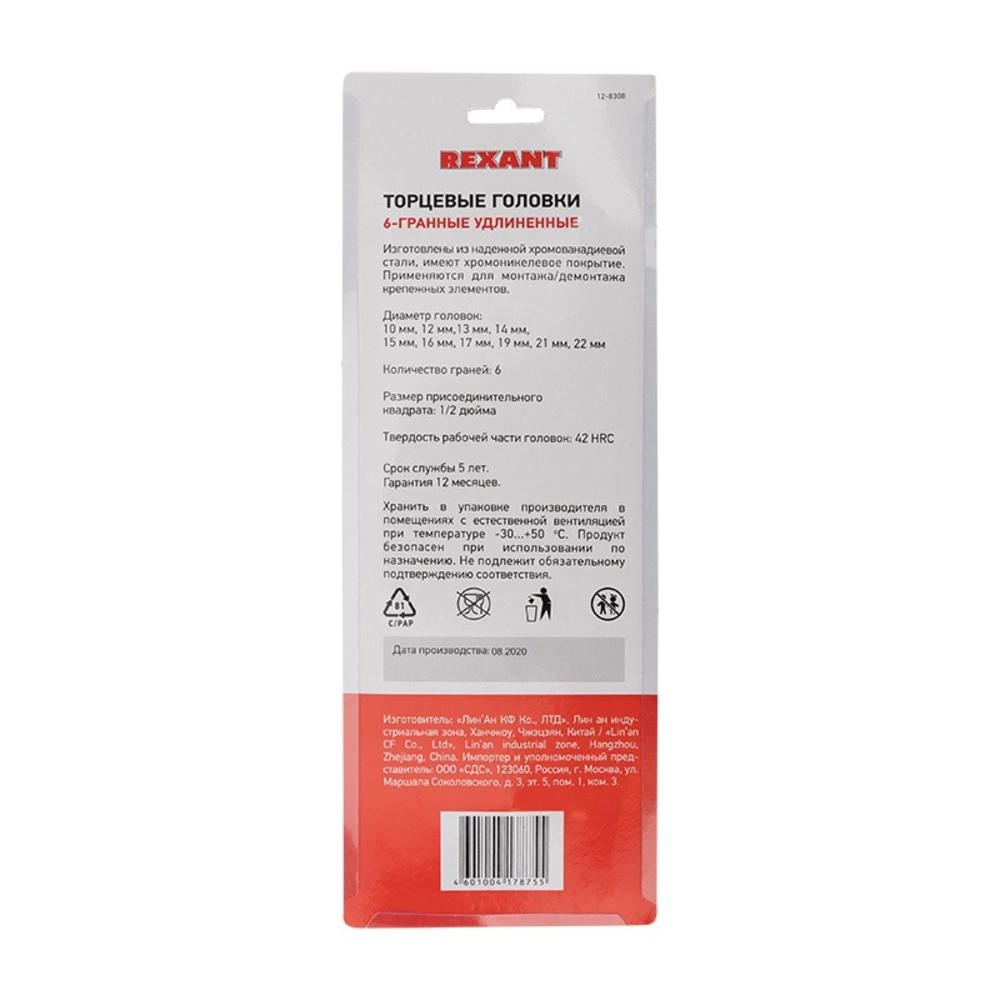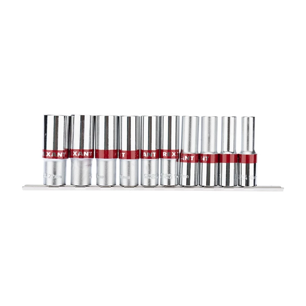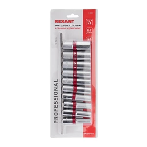 Набор головок REXANT используется для монтажа и демонтажа резьбовых соединений. Инструменты изготовлены из хромованадиевой износостойкой и долговечной стали с хромоникелевым покрытием. Твердость материала рабочей части головок – 42 HRС. В набор входят 6-гранные удлиненные торцевые головки на планке под квадрат 1/2" следующих размеров: 10, 12, 13, 14, 15, 16, 17, 19, 21 и 22 мм. Ярко-красная полоска предназначена для удобного поиска. Технические характеристики: Головка торцевая удлиненная, 10 мм: 1 шт. Головка торцевая удлиненная, 12 мм: 1 шт. Головка торцевая удлиненная, 13 мм: 1 шт. Головка торцевая удлиненная, 14 мм: 1 шт. Головка торцевая удлиненная, 15 мм: 1 шт. Головка торцевая удлиненная, 16 мм: 1 шт. Головка торцевая удлиненная, 17 мм: 1 шт. Головка торцевая удлиненная, 19 мм: 1 шт. Головка торцевая удлиненная, 21 мм: 1 шт. Головка торцевая удлиненная, 22 мм: 1 шт. Металлическая плашка-держатель: 1 шт. Количество предметов: 10 Количество граней: 6 граней Размер присоединительного квадрата: 1/2 дюйм Минимальный размер головки: 10 мм Максимальный размер головки: 22 мм Марка стали: CrV Назначение: для автомобиля Особенности: удлиненная, на держателе