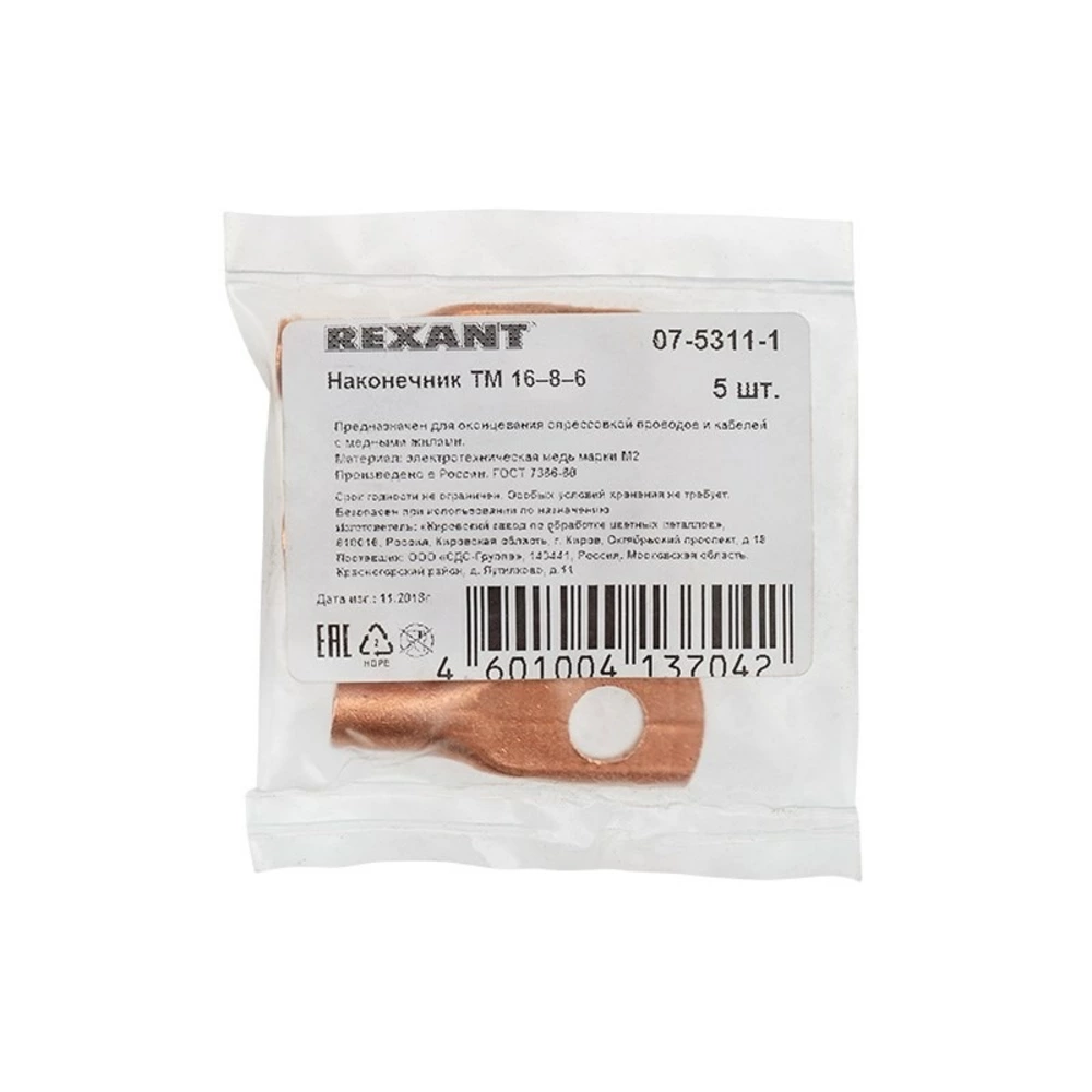 Наконечник Rexant 07-5311-1 ТМ 16–8–6 (16 мм - 8 мм) (в упак. 5 шт.)