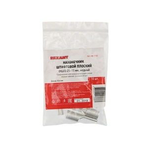 Наконечник кабельный медный штифтовой плоский (НШП) 25–15 (номинальное сечение наконечника мм²; длина контактной части мм). Назначение: для оконцевания опрессовкой медных кабелей сечением 25 мм² Длина каконечника (L): 33,6 мм Материал: электротехническая медь Покрытие: специальное олово-висмутовое, обеспечивающее защиту от коррозии и гарантирующее высокое качество соединения при любых погодно-климатических условиях. Сварной шов на участке контактного скругления под кабельную жилу делает трубную часть монолитной и гарантирует надежность опрессовки. Плоский штифт имеет рельефные насечки, обеспечивающие надежную фиксацию в прижимной клемме. Соединитель одного типоразмера возможно использовать на несколько сечений жил кабеля. Используются для подключения к выводам автоматических выключателей и прочим электрическим устройствам с ограниченной шириной контактной клеммы.