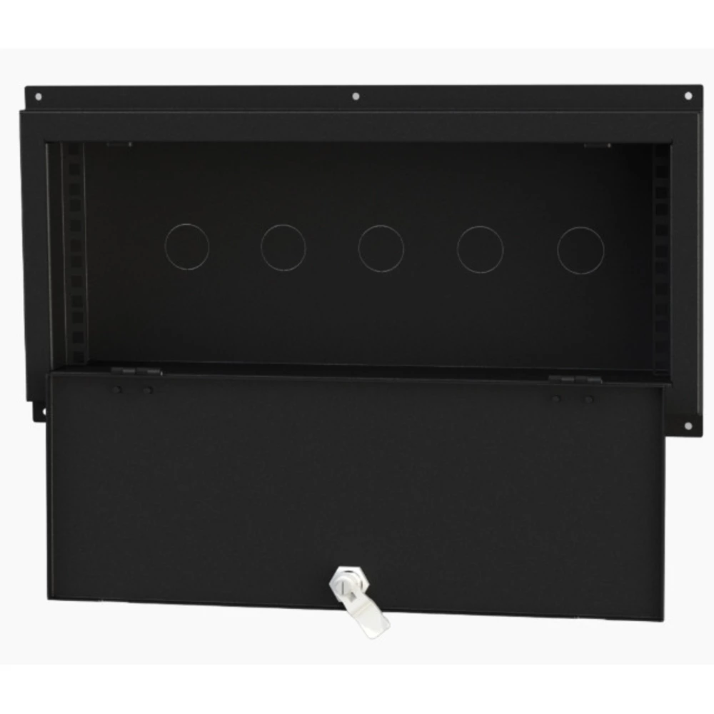 Лючок встраиваемый 4U, настенный, с дверцей (дверца с замком). Габариты (ДхШхГ) 532х266х98 мм. Посадочный размер (ДхШхГ) 498х195х80 мм. Количество кабельных заглушек в дне 5 шт. Количество кабельных заглушек в боковине 5 шт. Тип устанавливаемых панелей: рэковая панель 19" до 4U. В комплект входит 3 кабельных ввода размера PG29.Цвет: черный муар.