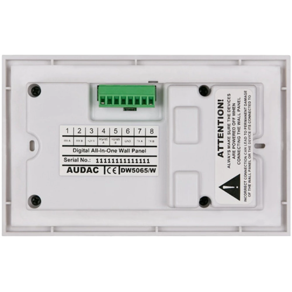 DW5065/W - настенная панель управления для мультизонных матричных систем распределения аудиосигналов Audac R2 и M2. Помимо функций выбора источников аудиосигнала и управления громкостью, предлагает порты для подключения микрофона и источника стереофонического аудиосигнала. Микрофонный порт поддерживает отключаемую функцию подачи фантомного питания (15 В). Управление функциями коммутатора осуществляется с помощью поворотного колесика-кнопки и 2,5" жидкокристаллического дисплея. Входные порты могут быть использованы для подключения к коммутатору дополнительных источников аудиосигнала. Подключение панели к коммутатору осуществляется по неэкранированному кабелю витой пары 6 категории. Панель выполнена в корпусе белого цвета.