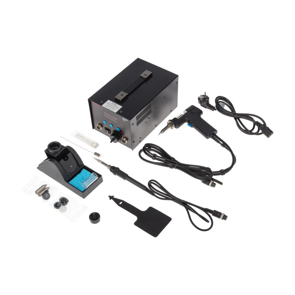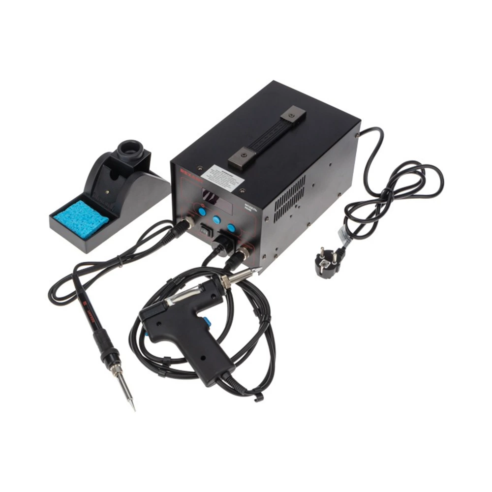Многофункциональная паяльная станция 2 в 1 применяется для демонтажа или пайки различных видов электронных компонентов. Используется для ремонта портативной электроники, бытовой техники, а также для сборочных операций в небольшом производстве. Станция оснащена классическим паяльником и демонтажным паяльником. Оба устройства автономны и могут работать независимо друг от друга. Микрокомпьютер для цифрового отображения данных и контроля температуры с точностью до 1 °C, большая мощность, быстрый разогрев. Все эти преимущества делают бессвинцовую распайку или пайку безопасной для таких чувствительных компонентов как SOIC, PLCC, QFP, BGA и т. д. В комплектацию станции входят: основной блок, паяльник, демонтажный паяльник, держатель паяльника, губка для очистки жала паяльника (в ложементе)