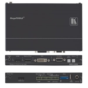 SID-X3N – преобразователь сигналов HDMI, DVI-D, DisplayPort и VGA со стереоаудио в сигнал HDMI с поддержкой HDCP и EDID. Устройство имеет выход стереоаудио на разъеме miniJack 3,5 мм. Кнопка Input Select позволяет выбрать один из четырех видов входных сигналов. Прибор оснащен кнопкой Step-In для управления функцией дистанционной активации устройства.