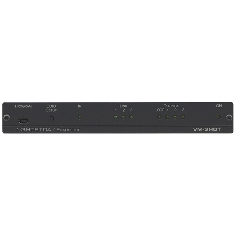 VM-3HDT – усилитель-распределитель 1:3, передатчик сигнала HDMI 2.0 разрешением до 4K/60 (YUV 4:2:0), двунаправленного сигнала RS-232 и сигналов ИК-управления в витую пару (технология HDBaseT 1.0), позволяющий передавать высококачественное видео 1080p/60 и сигналы управления по одному кабелю витой пары на расстояние до 70 м (40 м для 4K/60). Поддерживаются технологии HDCP 1.4, расширенный EDID и CEC (только на 1 выходе). Также передается встроенный звук формата 7.1 PCM, Dolby TrueHD, DTS-HD, поддерживается Lip Sync. Устройство имеет проходной выход HDMI для мониторинга. Совместимый приемник: TP-580R.