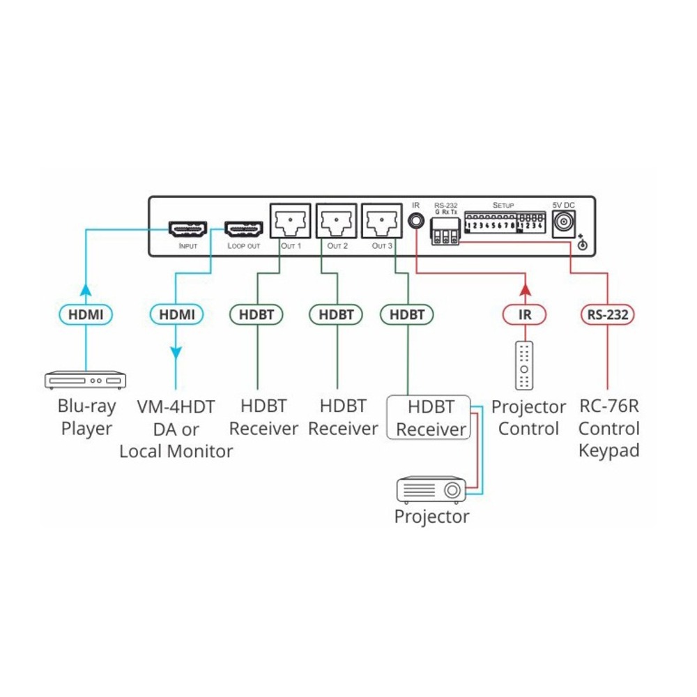 • Распределяет 1 сигнал HDMI разрешением 4K на 3 выхода HDBaseT с увеличением дальности передачи