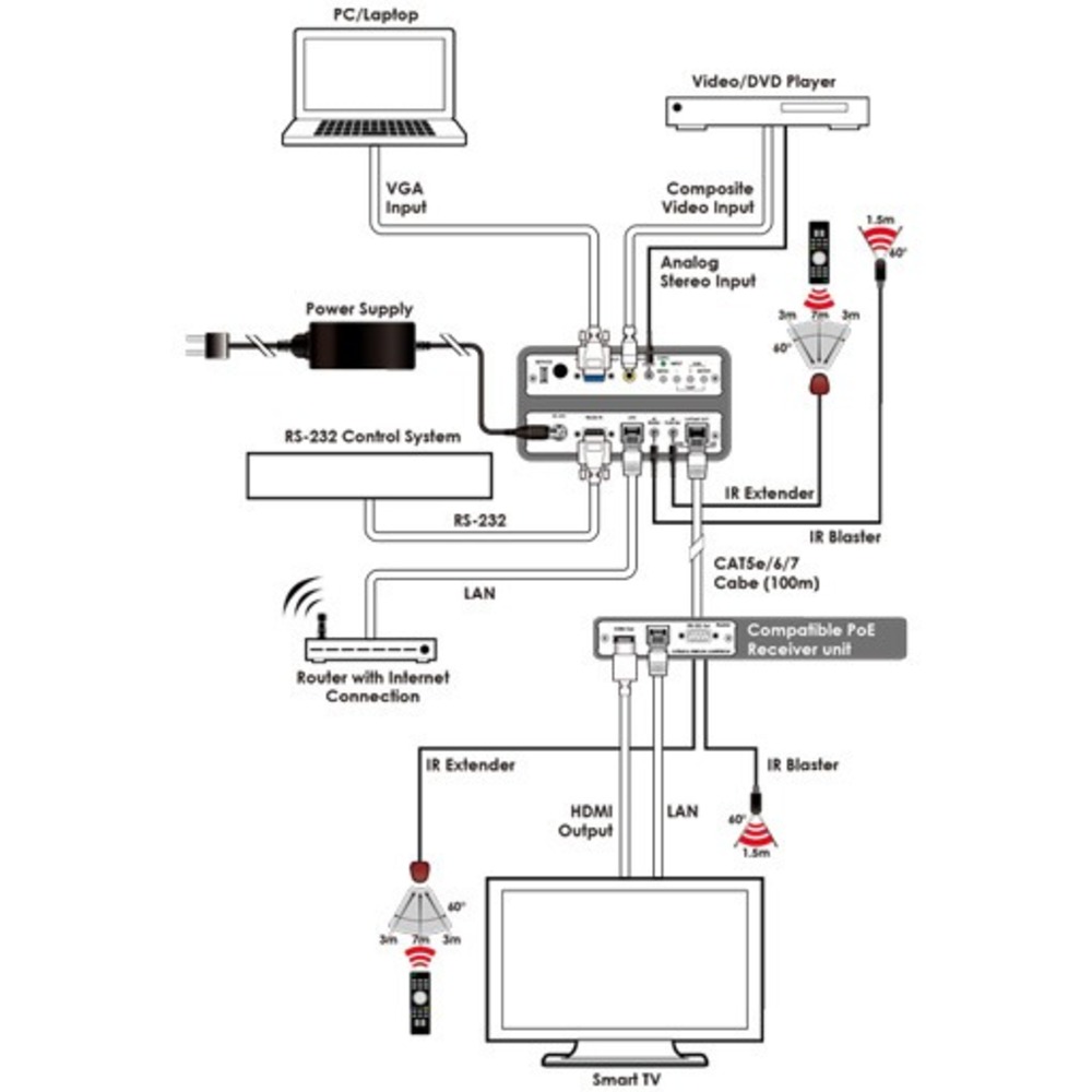 CH-516TXAS – передатчик и масштабатор сигналов композитного видео и компьютерной графики, стерео аудио, Ethernet, двунаправленного интерфейса RS-232 и инфракрасного управления в витую пару. Преобразует перечисленные сигналы в пригодные для передачи по кабелю витой пары. Обратное преобразование производит приемник. Позволяет переключаться между входами видео, масштабирует видеосигнал с повышением разрешения вплоть до 1080p и WUXGA. Длина линии передачи по одному кабелю витой пары CAT5e, 6 или 7 – до 100 метров. Управление осуществляется кнопками лицевой панели, с помощью пульта дистанционного управления или через экранное меню. Поддерживает двунаправленную подачу питания по кабелю витой пары.