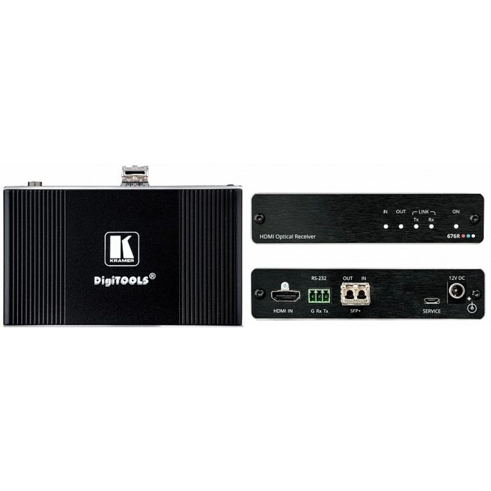 676R – приемник сигналов HDMI с разрешением до 4К@60 Гц (4:4:4), а также сигналов RS-232 по кабелю на основе одномодового или многомодового оптического волокна на расстоянии до 33 км. Прибор обеспечивает преобразование светового сигнала, передаваемого по оптоволоконному кабелю, в сигнал HDMI, а также сигнал RS-232. В составе приёмника 676R поставляется многомодовый встраиваемый SFP+ модуль, однако в приборе могут использоваться и другие совместимые модули Kramer, в частности одномодовые SFP+ модули.