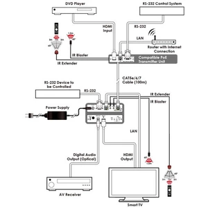 - Технология HDBaseT 5Play™: передача по одному кабелю витой пары видео и аудио высокой четкости, Ethernet и сигналов управления (двунаправленный ИК и RS-232), питание по кабелю витой пары