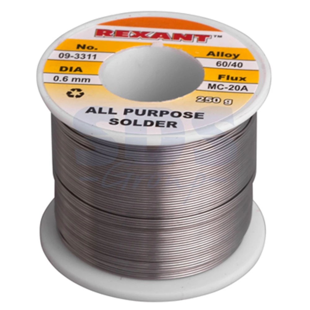 Припой с канифолью REXANT представляет собой проволоку (диаметром 0,6 мм) из сплава олова (60 %) и свинца (40 %). Используется в пайке для соединения деталей между собой и позволяет создать герметичный, механически прочный (устойчивый) шов. Нагреваясь до температуры плавления (183...188 °C) припой: расплавляется, смачивает спаиваемый металл и, растекаясь по нему — заполняет место между соединяемыми деталями.