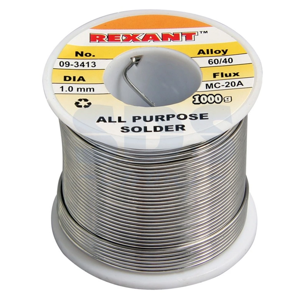 Припой с канифолью REXANT представляет собой проволоку (диаметром 1 мм) из сплава олова (60 %) и свинца (40 %). Используется в пайке для соединения деталей между собой и позволяет создать герметичный, механически прочный (устойчивый) шов. Нагреваясь до температуры плавления (183...188 °C) припой: расплавляется, смачивает спаиваемый металл и, растекаясь по нему — заполняет место между соединяемыми деталями.