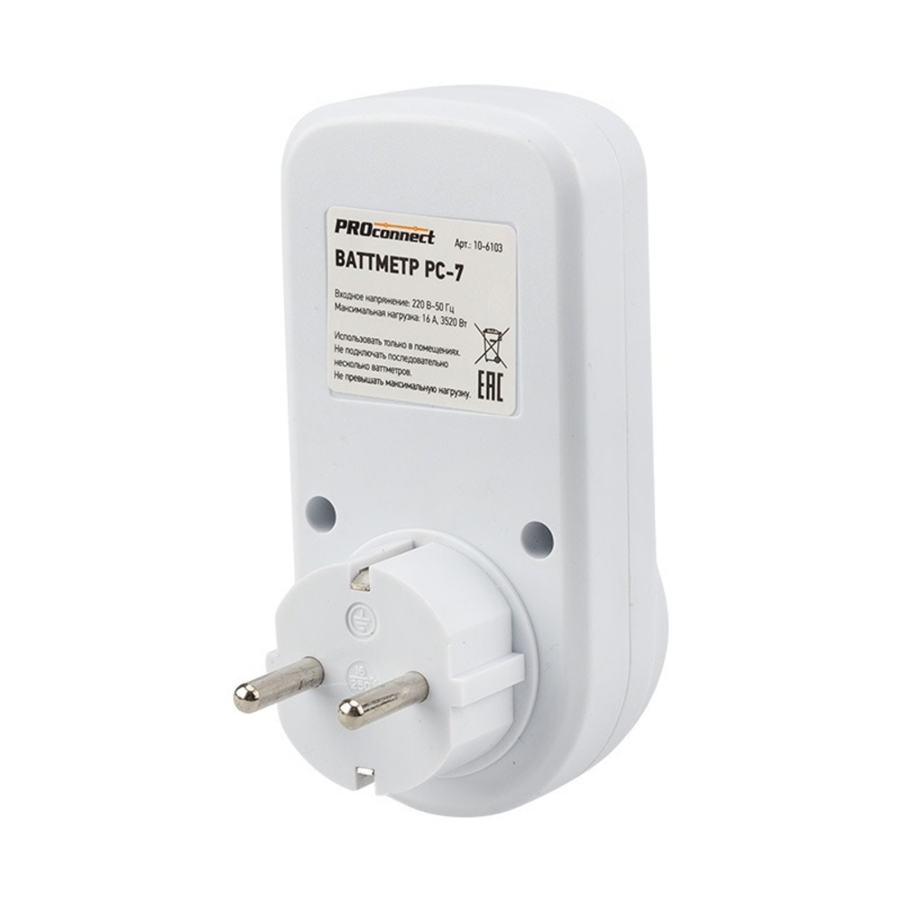 Счетчик потребляемой электроэнергии (ваттметр) PRОconnect PC-7 предназначен для измерения и контроля потребления электроэнергии различными приборами, суммарный ток которых не превышает 16 А. PC-7 оснащен возможностью установки цены киловатт-часа, что позволяет узнать и рассчитать стоимость использованной приборами электроэнергии. Данная модель идеальна для измерения энергопотребления при однотарифном учете, при двухтарифном учете суммарные результаты будут отображаться некорректно. Ваттметр PC-7 оснащен ЖК дисплеем и тремя кнопками управления. Отображаемые параметры: Активная потребляемая мощность подключенной нагрузки Количество кВт/ч, потребленных подключенной нагрузкой Суммарная стоимость потребленной электроэнергии Цена одного кВт/ч Технические характеристики: Вход: 220 V~50 Гц Максимальная нагрузка: 16 A, 3680 Вт Минимальная отображаемая мощность: 0,1 Вт Точность измерения: +/- 1 % или +/- 0,1 Ватт (0-100 Ватт); +/- 1 % (100-3600 Ватт) Точность подсчета суммарного энергопотребления: +/- 1 % Минимальное отображаемое энергопотребление: 0,01 кВт/ч Диапазон суммарного энергопотребления: 0,00-9999,99 кВт/ч Диапазон цены одного кВт/ч: 0,00-9999 Энергопотребление в режиме ожидания: <0.5 W Рабочая температура: 5...+40 °C
