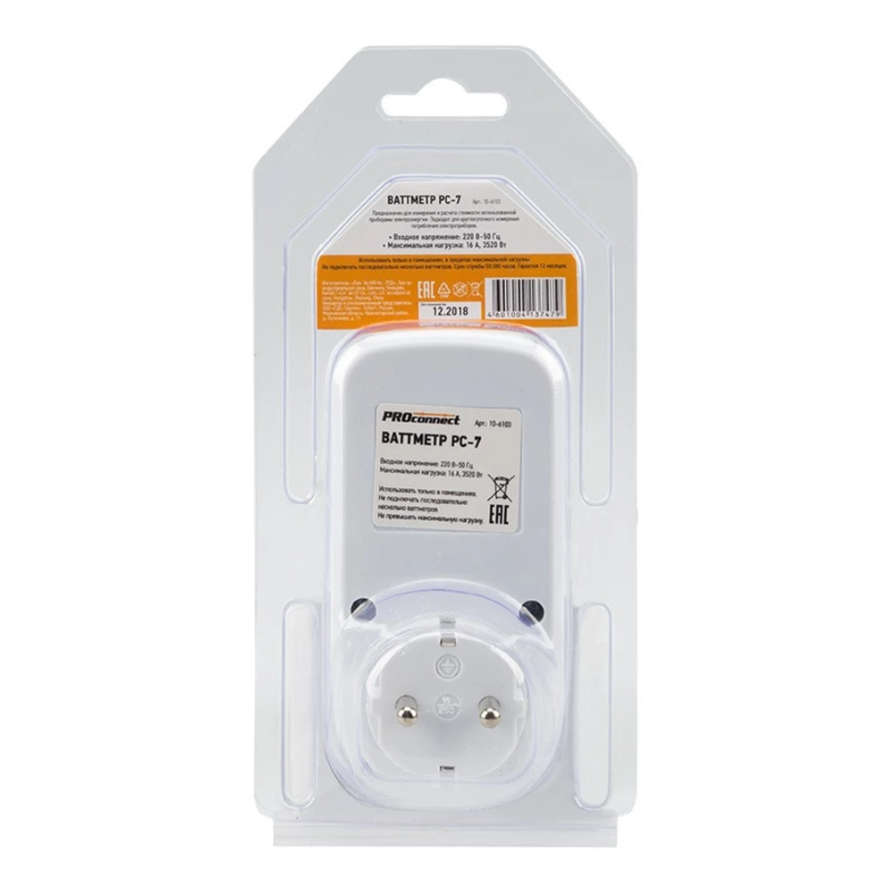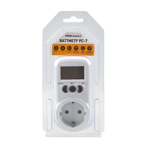 Счетчик потребляемой электроэнергии (ваттметр) PRОconnect PC-7 предназначен для измерения и контроля потребления электроэнергии различными приборами, суммарный ток которых не превышает 16 А. PC-7 оснащен возможностью установки цены киловатт-часа, что позволяет узнать и рассчитать стоимость использованной приборами электроэнергии. Данная модель идеальна для измерения энергопотребления при однотарифном учете, при двухтарифном учете суммарные результаты будут отображаться некорректно. Ваттметр PC-7 оснащен ЖК дисплеем и тремя кнопками управления. Отображаемые параметры: Активная потребляемая мощность подключенной нагрузки Количество кВт/ч, потребленных подключенной нагрузкой Суммарная стоимость потребленной электроэнергии Цена одного кВт/ч Технические характеристики: Вход: 220 V~50 Гц Максимальная нагрузка: 16 A, 3680 Вт Минимальная отображаемая мощность: 0,1 Вт Точность измерения: +/- 1 % или +/- 0,1 Ватт (0-100 Ватт); +/- 1 % (100-3600 Ватт) Точность подсчета суммарного энергопотребления: +/- 1 % Минимальное отображаемое энергопотребление: 0,01 кВт/ч Диапазон суммарного энергопотребления: 0,00-9999,99 кВт/ч Диапазон цены одного кВт/ч: 0,00-9999 Энергопотребление в режиме ожидания: <0.5 W Рабочая температура: 5...+40 °C