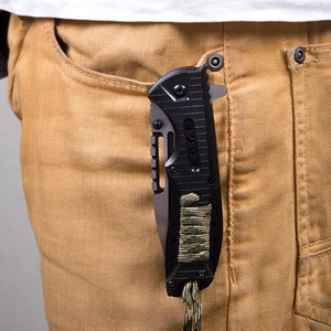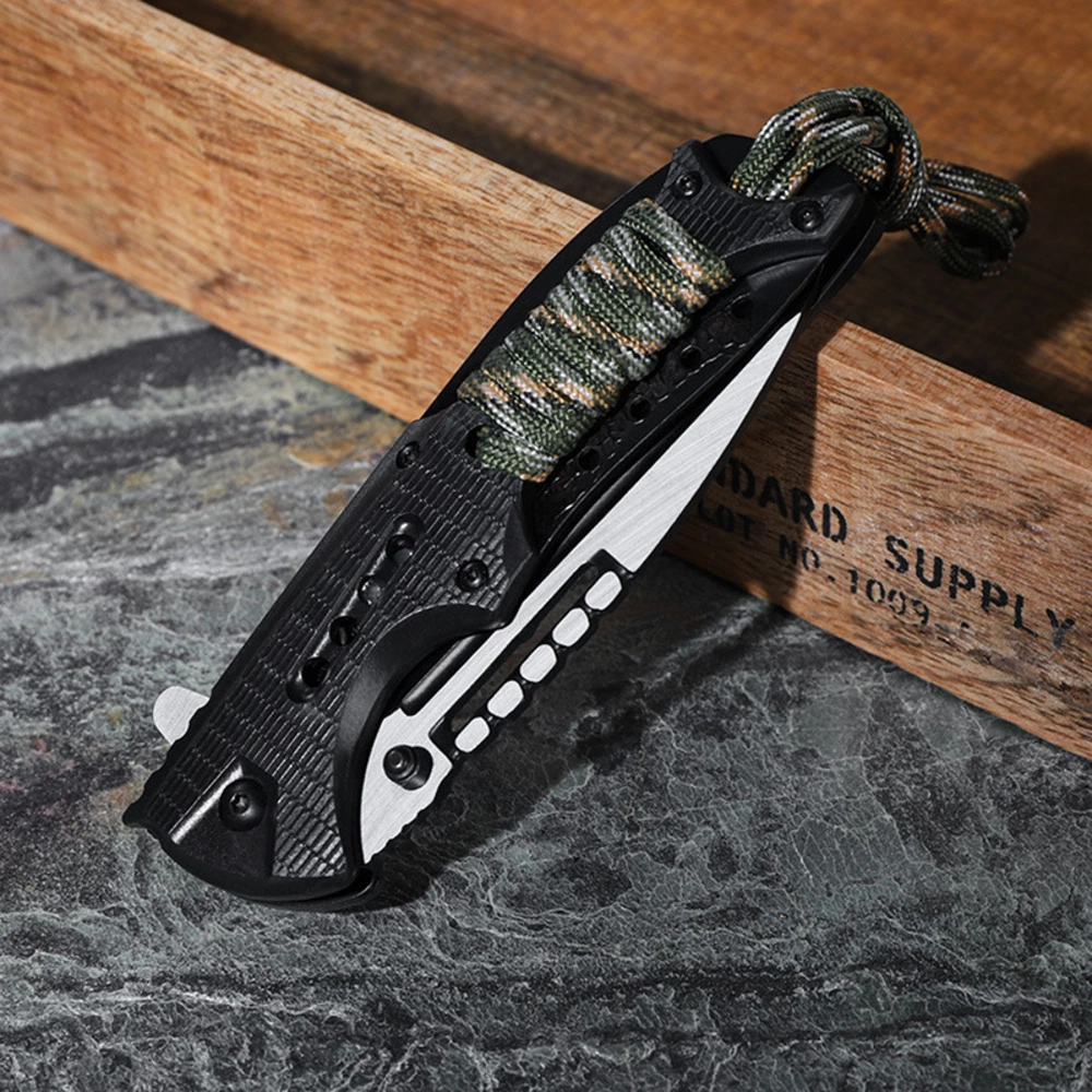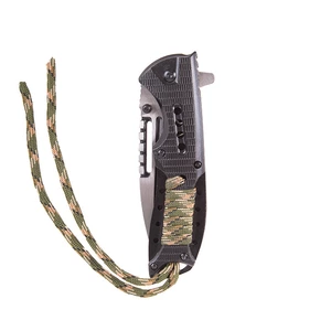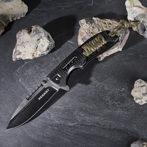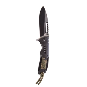 Универсальный складной нож широко применяется в хозяйственных работах и туризме. Нож очень удобен в применении благодаря остро заточенному лезвию, изготовленному из высококачественной нержавеющей стали. Эргономичная рукоятка обеспечивает максимальную прочность и удобство в использовании ножа. Удобная конструкция позволяет легко и быстро открывать нож одной рукой. Самопроизвольное складывание клинка во время работы ограничивает линейный фиксатор (Liner lock), что делает работу ножом более безопасной. Нож оснащен клипсой для крепления к поясу для комфортной переноски. Длина: - общая 215 мм - лезвие 93 мм - рукоять 122 мм Вес: 123 г Материал: лезвие из нержавеющей стали (420) с черным покрытием Твердость: 50-54 HRC Пластиковая рукоятка 1. Замок-фиксатор Liner lock 2. Упор для большого пальца 3. Зажим для крепления к ремню 4. Веревка на рукоятке