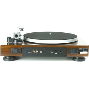 Двухскоростной проигрыватель виниловых пластинок с ременным приводом, в комплекте с тонармом, установленным духовым картриджем для мюзик-холла и встроенным фонокорректором.