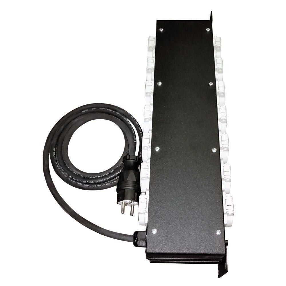 Рэковый дистрибьютор питания. Вход: 2х метровый кабель H07RN-F 3G2,5 и обрезиненная вилка PCE Schuko 16A; Выход: панельная розетка 14хPCE Schuko 16A; Индикация: 1 индикатор фазы, 1 индикатор на включение; Защита: термопредохранитель на 16А; Габариты корпуса: Rack 19” 2 Unit (485x105x88мм)
