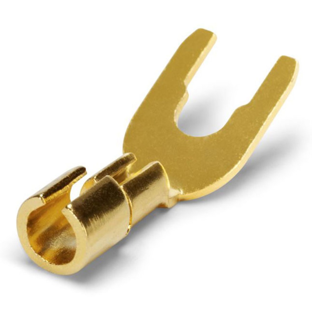 Разъем HICON акустический "лопатка" угловой 25° на кабель диаметром до 6,0 мм сечением 1,5 - 8,0 кв. мм, позолоченный контакт, клеммный кабельный зажим, металлический позолоченный корпус, разлет лопатки: 7,7 мм