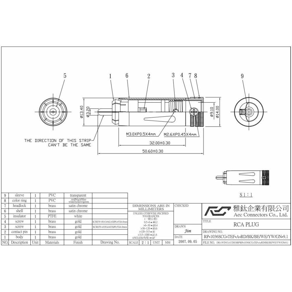 AEC RP 1036 имеет зажимную (цанговую) конструкцию, тем самым обеспечивая плотный и надёжный контакт с RCA разъёмом.