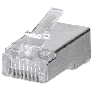 Кабельный разъём RJ45, CAT 6,  <штекер/папа>, экранированный, для витой и цельной жилы, корпус- металл /пластик, контакты - покрытие золото, под обжим, для проводников (0.50-0.57 мм), диаметр изоляции проводника (до 1.05 мм), класс защиты (IP20), без колпачка, на кабель диаметром (5.0-8.0 мм), цвет: никель