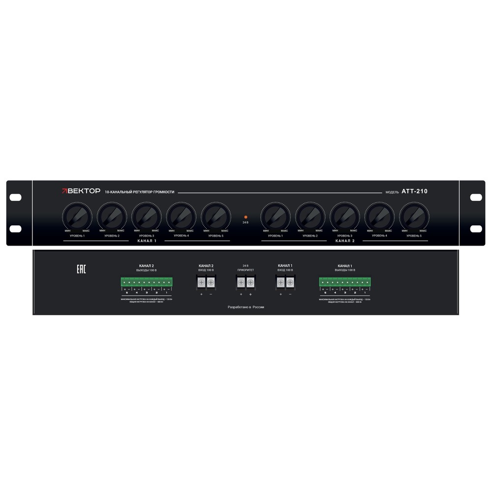 Вектор АТТ-210 Пассивный десяти зонный регулятор громкости (Блок аттенюаторов). Пассивный 10-зонный регулятор громкости, с автоматическим отключением регулировки в случае аварийной ситуации. Два входных канала с максимальной нагрузкой на канал – 600 Вт.