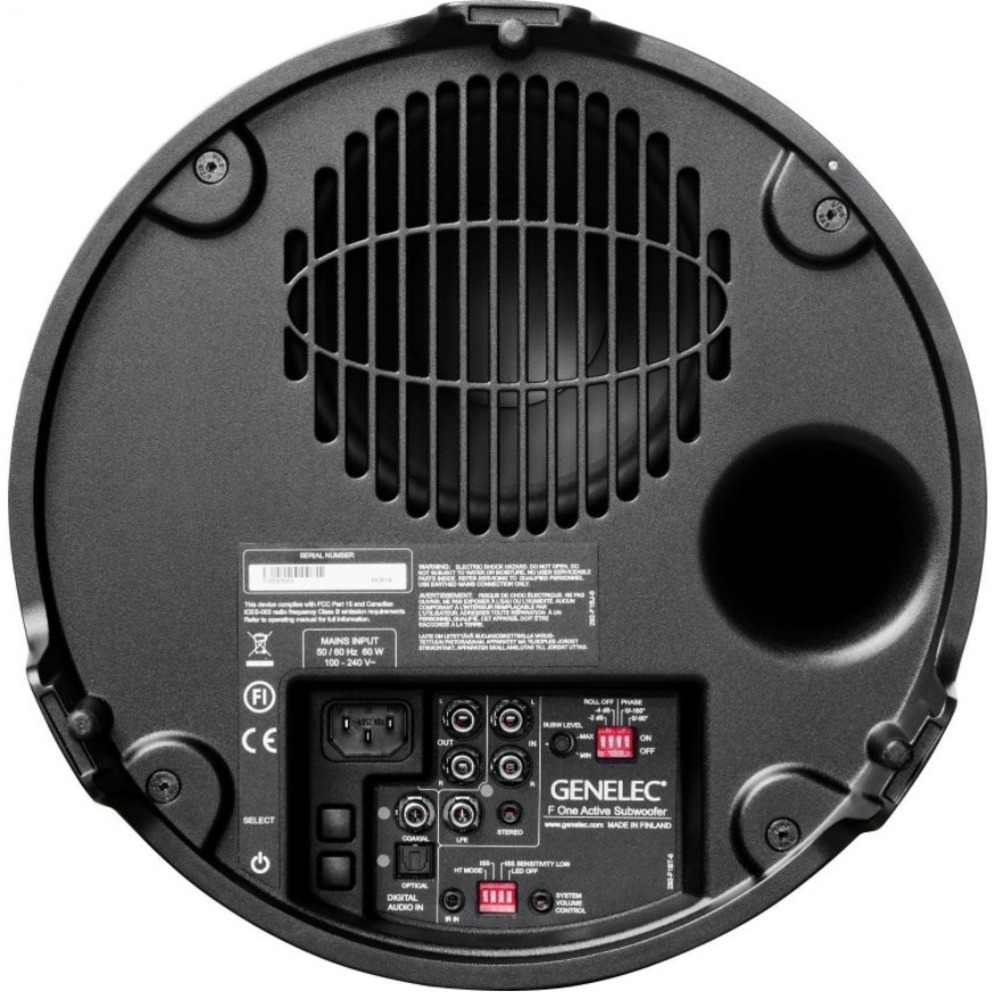 Genelec F One - Активный сабвуфер, является одной из самых компактных моделей в каталоге фирмы и предназначен для совместной работы с пятью сателлитами Genelec G One или парой более крупных колонок G Two или G Three. Сабвуфер способен расширить общий частотный диапазон системы до 35 Гц на басах и хорошо согласуется с основной акустикой в жилых помещениях. Общую громкость звучания системы можно регулировать с помощью пульта ДУ, который прилагается к Genelec F One. Сабвуфер имеет встроенную систему управления басами для пяти основных каналов на частотах ниже 85 Гц непосредственно для F One, а на более высоких частотах – через выходы для подключения сателлитной акустики. Аппарат оснащен шестью RCA-входами для 5.1-каналов системы окружающего звучания и 3,5-мм mini-jack входом. Это позволяет подключать Genelec F One к различным источникам сигнала, оснащенным как RCA, так и mini-jack выходами. Также предусмотрено пять выходов для подключения активных акустических систем основных каналов. Все разъемы смонтированы на нижней панели сабвуфера, что позволяет сделать подключение кабелей практически незаметным.