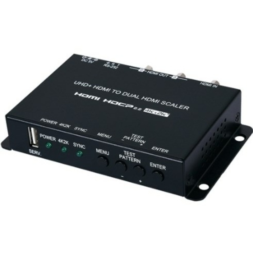 CPLUS-V2PEL – сдвоенный масштабатор сигнала HDMI разрешением до 3840x2160/60 (4:4:4, 8 бит) с поддержкой HDCP 1.4, 2.2, EDID и HDR. Поддерживает повышающее и понижающее масштабирование. Результирующий сигнал подается на 2 выхода с разными разрешениями. Имеется встроенный генератор тестовых сигналов с настраиваемым разрешением. Полоса пропускания 600 МГц. Управление устройством по RS-232.