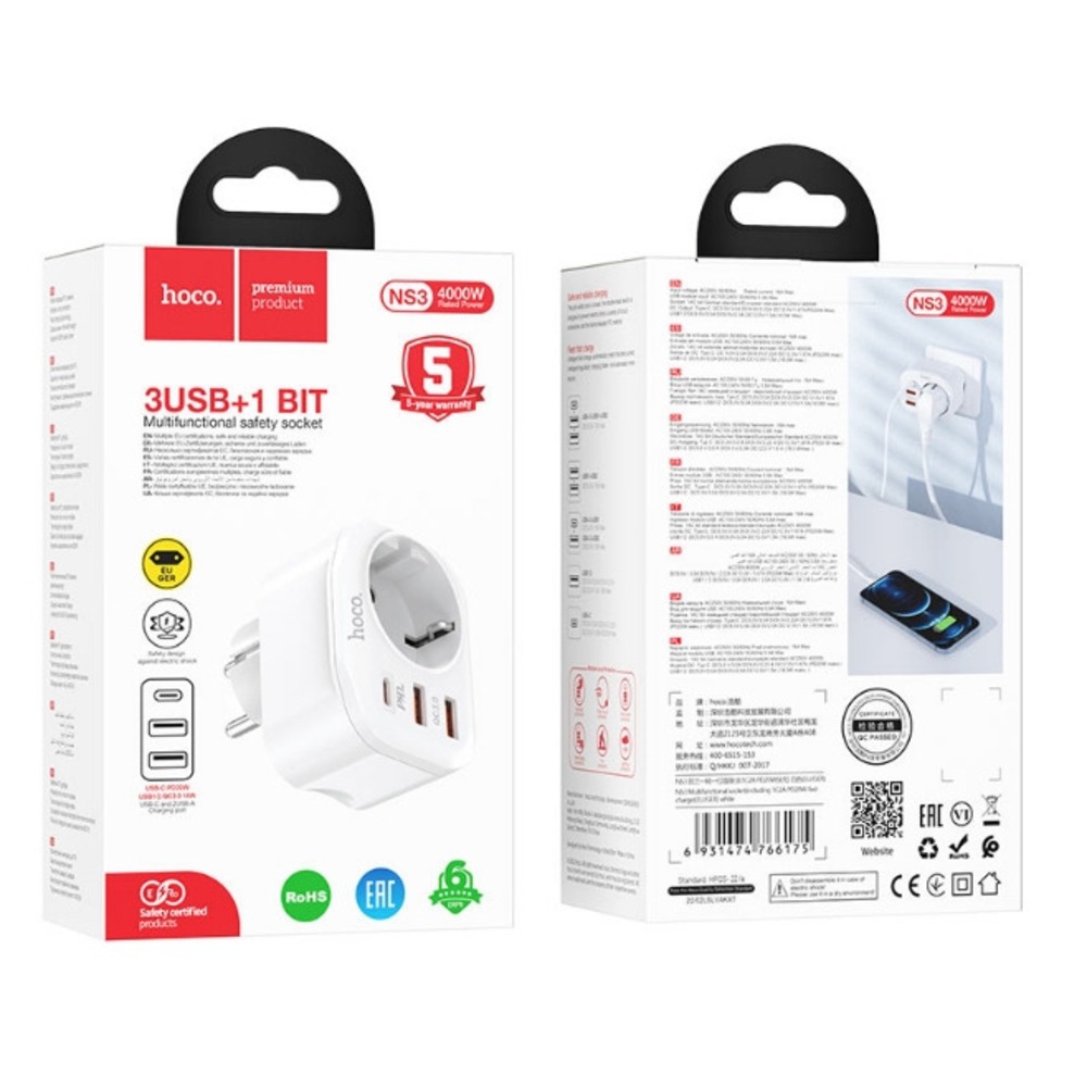 Сетевой фильтр однорозеточный с USB Hoco NS3