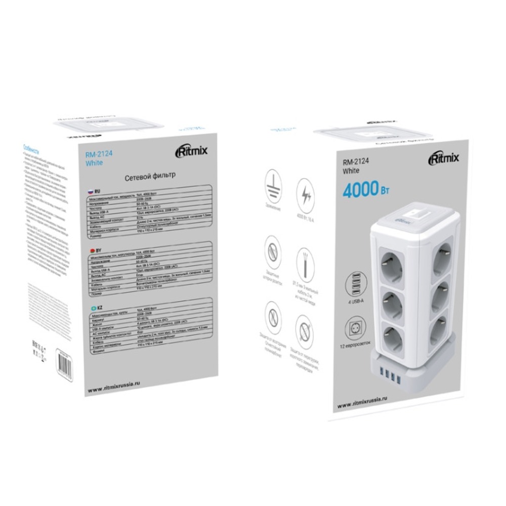 Удобно расположенных розеток недостаточно для подключения нескольких ваших устройств одновременно? Розетка находится далеко или очень низко под рабочим столом? В комплекте с новыми наушниками, колонкой или смарт часами идет только USB кабель? Вас точно порадует универсальный сетевой фильтр–башня RM-2124. Он отлично подходит для современной мобильной, домашней или офисной техники. И суммарно поддерживает потребление до 4000 Вт. 12 розеток и 4 порта USB позволяют одновременно подключить для питания или зарядки до 16 устройств. Премиальное качество сборки и компонентов для надёжной и долговечной работы.