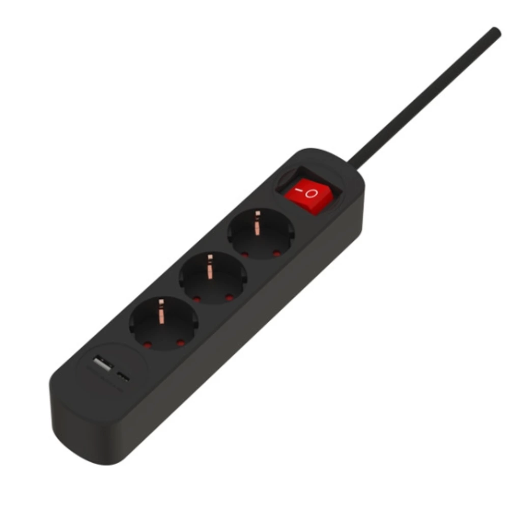 - 3 евророзетки переменного тока расположены под углом 45о относительно корпуса фильтра, что исключает наслоение подключаемых к нему вилок. Конструкция включает в себя защитные шторки и контакты заземления, что в разы повышает безопасность при использовании прибора. Корпус устройства изготовлен из огнеупорного полимера, а силовой 2-метровый кабель – из 100% меди