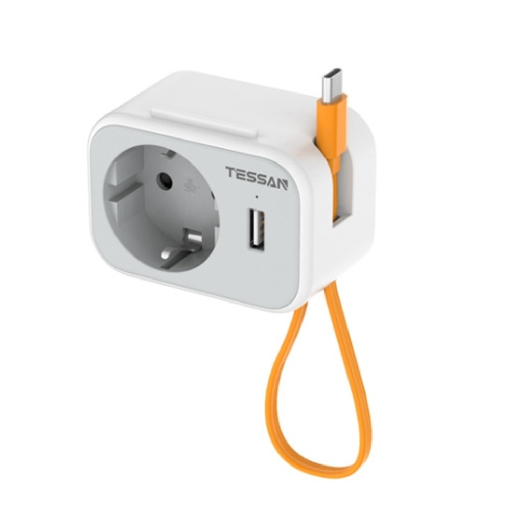 Сетевой фильтр с 1 розеткой 220В, 1 USB портом и 1 встроенным кабелем USB Type C.